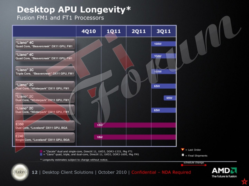 Nel terzo trimestre 2011 verranno presentate le APU Llano costituite da 4/3/2 core ed il loro TDP varierà tra 100 e 65W. Il socket di queste APU sarà il nuovo FM1.