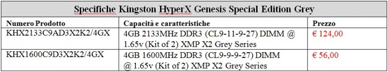 Le memorie HyperX Genesis Special Edition Grey sono disponibili in kit DDR3 da 4GB, con una frequenza di 2133MHz e 1600MHz. La Kingston HyperX è coperta da garanzia a vita e da assistenza 24 ore su 24, 7 giorni su 7.