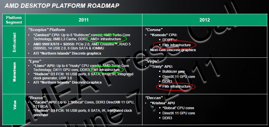 Secondo la Roadmap il socket sarà su base "FMx" e non sull'attuale "AMx"; in poche parole il socket AM3+ e i chipset serie 900 saranno abbandonati già nel 2012.