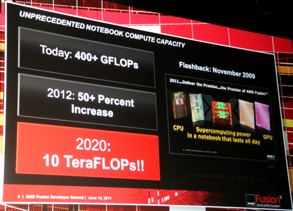 Guardando molto più avanti nel tempo, nel 2020, AMD prevede che la potenza elaborativa delle APU presenti nelle cpu potrà raggiungere l'impressionante valore di 10 TeraFLOPS, le stesse di due Radeon HD 6990.