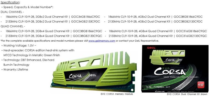 Passiamo invece all'altro kit di Geil le Evo Corsa ram DDR3 appositamente studiato per i chipset P67 e Z68. Queste memorie lavorano con frequenze fino a 2133 Mhz, dispongono sempre di heatsink con tecnologia MTCD ed hanno una colorazione verde come possiamo vedere dall'immagine seguente.