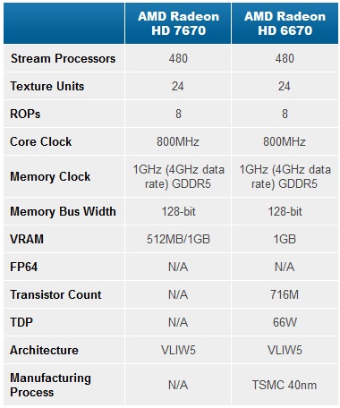 La HD 7670, con interfaccia PCI-Express 2.1 x16, è dotata di 480 Stream Processors, 24 texture units, 8 ROPs, frequenza di 800 MHz, memoria da 512 MB o 1 GB GDDR5 operante alla frequenza di 1 GHz (4 GHz) e banda di memoria da 128-bit.