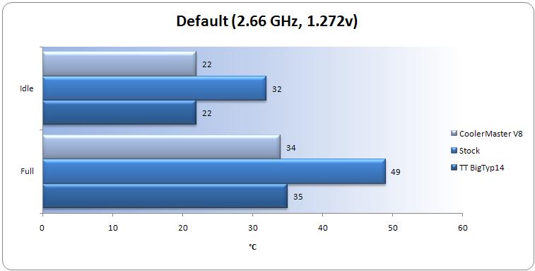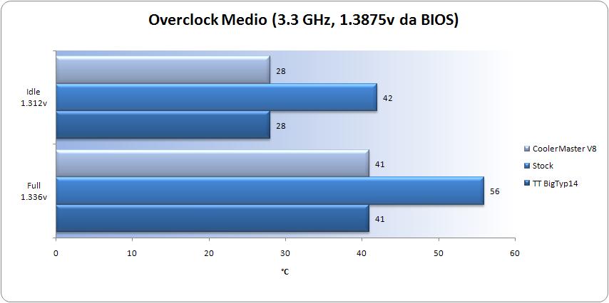 I risultati ottenuti confermano la bontà di questo dissipatore. Incredibile il testa a testa con il BigTyp14Pro che manifesta temperature del tutto identiche fino a 3,3Ghz andandosi a discostare di 1 solo grado a 3,6ghz. Ciò mostra che siamo al limite della capacità dei dissipatori ad aria. L'efficienza della struttura del CoolerMaster V8 si mostra abbassando il regime di rotazione della ventola in cui l'innalzamento di temperatura dovuto al minore flusso d'aria è più contenuto (3 gradi) rispetto al dissipatore della ThermalTake (5-6 gradi). Buona la rumorosità del CoolerMaster V8, molto silenzioso e quasi inudibile al minimo dei giri, mentre risulta inevitabilmente un po' più rumoroso al massimo dei giri. D'altra parte anche con la ventola al minimo le temperature rilevate sono ottime quindi non c'è pericolo di preoccuparsi della rumorosità.