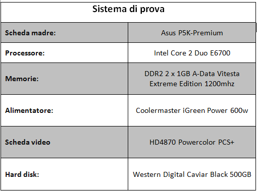 Abbiamo testato il dissipatore sul seguente sistema, montato su un banchetto, con temperatura ambiente di circa 25°C: