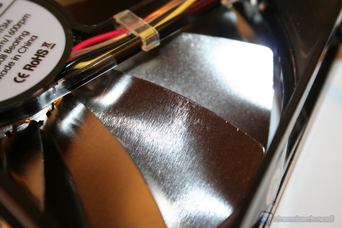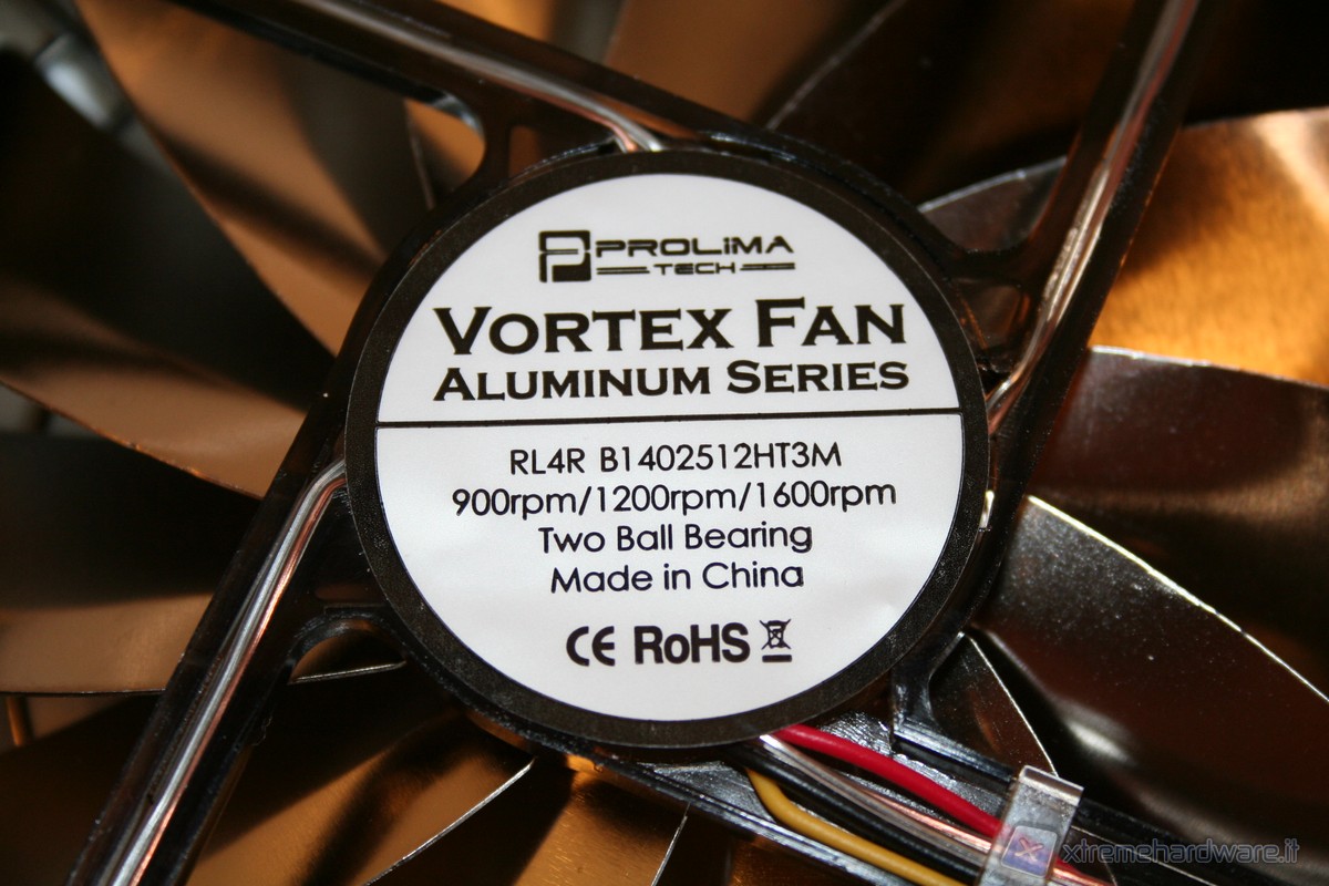 La Vortex Aluminum Series rappresenta una delle più potenti ventole da 140mm attualmente presenti sul mercato. L’imponente quantitativo di CFM assieme al contenuto rumore di fondo complessivo permette a questa ventola di essere il candidato ideale laddove si richiede un’elevatissima pressione statica, alto CFM e quella sicurezza che solo una, o più, ventola/e del genere può/possono dare. La struttura in ABS unita alle 13 pale in alluminio conferisce a questa ventola un aspetto molto particolare. Apprezzabile la scelta di fornire una griglia di protezione, anche perché essendo il materiale alluminio potrebbe esserci un serio pericolo per la vostra sicurezza ed in particolare per le vostre dita. Come già accennato sono presenti ben 13 pale, particolarmente sovrapposte al fine di aumentare sia il flusso d’aria, sia la pressione statica. Inoltre il motore non è più il comune, Sleeve Bearing bensì il più rumoroso Two Ball Bearing, che conferisce però alla ventola una durata di vita maggiore. Questa ventola, similmente alle Vortex Red Led, presenta quattro LED di colore rosso, molto belli all’interno del case.