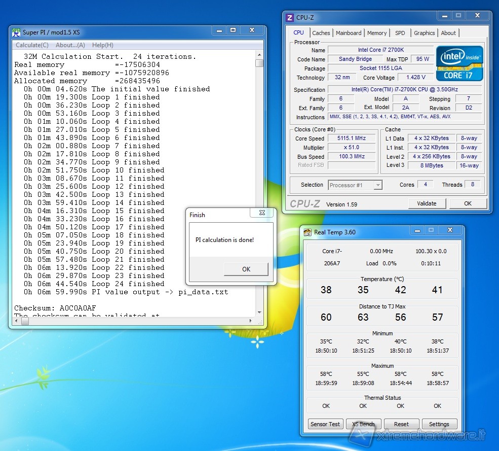Sono ottime le performance complessive, specialmente se rapportate al dissipatore stock Intel. Consigliamo l’aggiunta di una seconda ventola, al fine di migliorare ulteriormente le performance e diminuire la rumorosità complessiva, settandole a regimi di rotazione inferiori. Riportiamo anche degli screen dell’overclock massimo raggiunto. Il dissipatore stock Intel non è stato in grado di reggere la configurazione in overclock, dato che già a default le temperature erano decisamente elevate. Con 1,45V è stato possibile raggiungere la frequenza di 5115MHz; è stato persino possibile conseguire un test di SuperPi da 32 MB e wPrime da 32M.