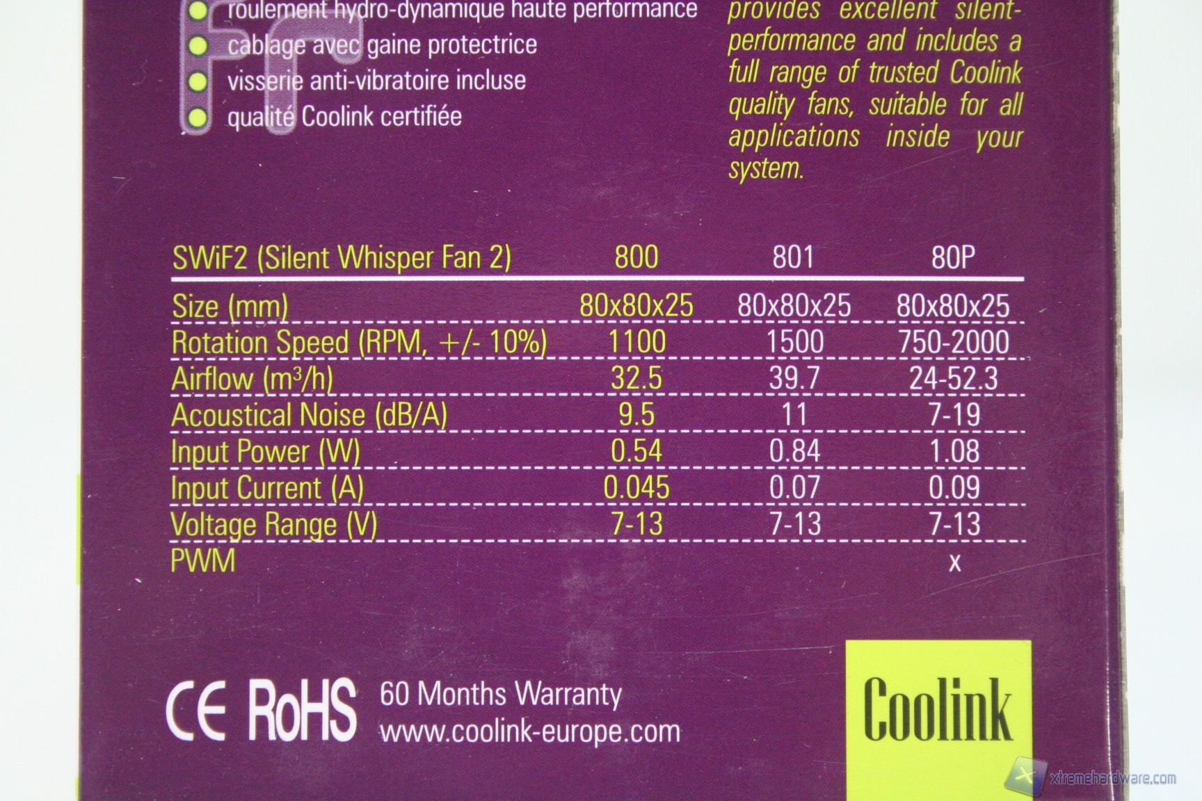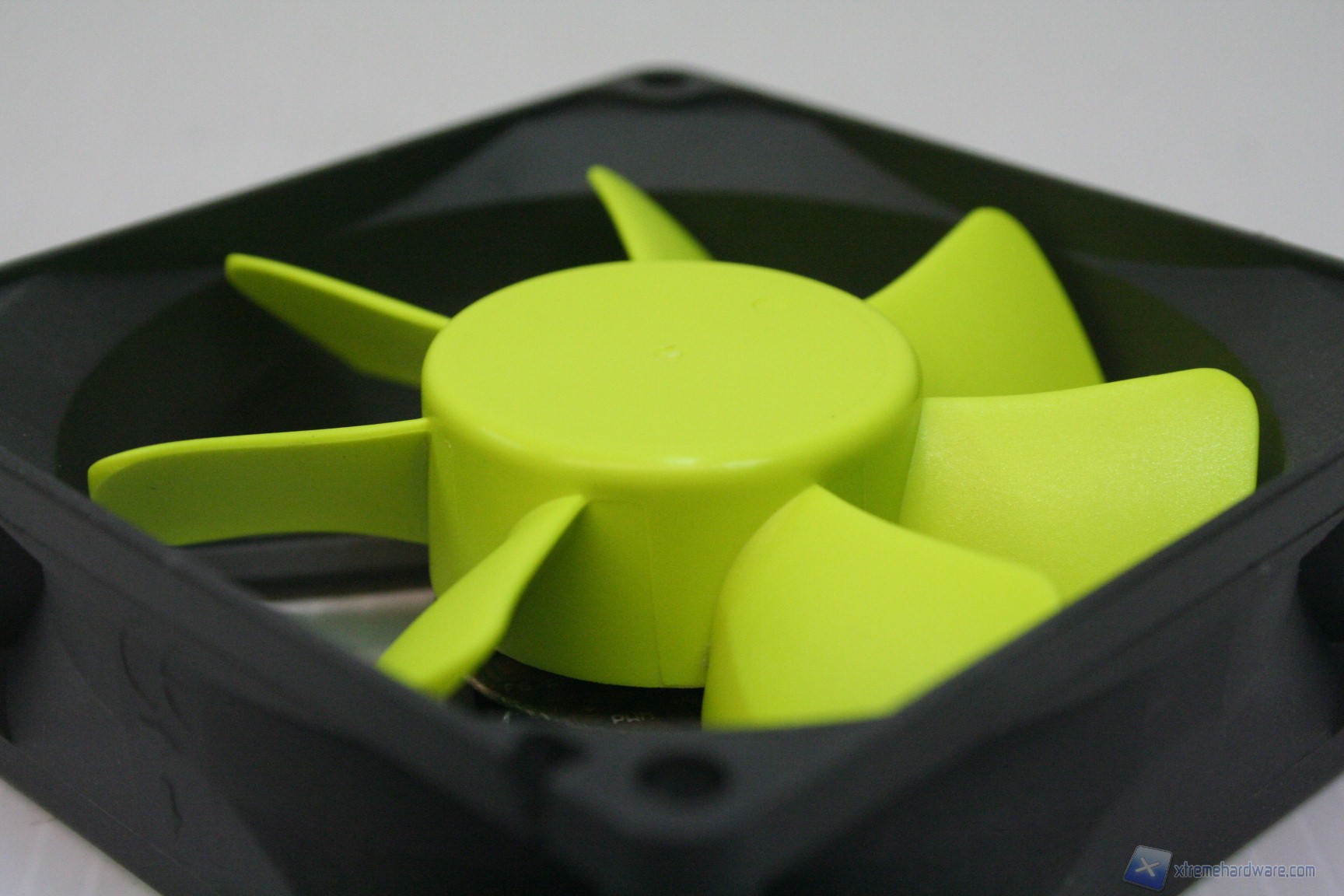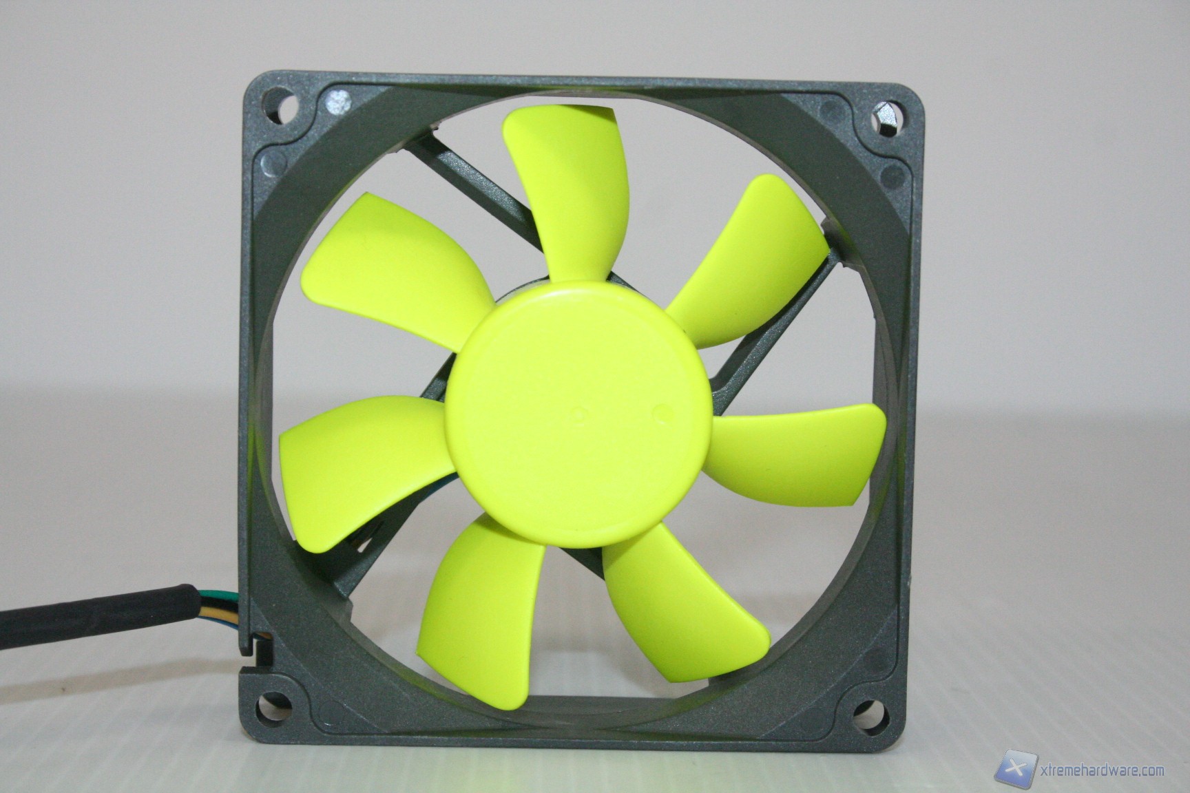 La struttura è standard, eccetto la colorazione verde limone scuro delle pale, che sono specifiche per la ventilazione di case e quindi non molto appropriate per dissipatori (anche se per questa tipologia è irrilevante). Il motore è di grandi dimensioni e la funzionalità PWM è specifica solo per il modello 80P. Non è noto l’MTBF, se non che è riportata la presenza dell’Hydro-dynamic bearing. Nella confezione del modello 80P è inserito un connettore che permette la regolazione appaiata delle ventole, un “PWM split cable”, simile quindi alle soluzioni Arctic Cooling. Il numero delle pale, come il CFM e la pressione statica sono standard. Il telaio non presenta particolarità degne di nota e le pale non sono removibli. Il target di utenza è specifico per tutti coloro che necessitano di ventole generiche per la sostituzione, o il potenziamento, di quelle in un cabinet o dissipatore low profile. La rumorosità non sarà una caratteristica di questi modelli, anche se ovviamente a 2000RPM il modello 80P comincia a farsi sentire.