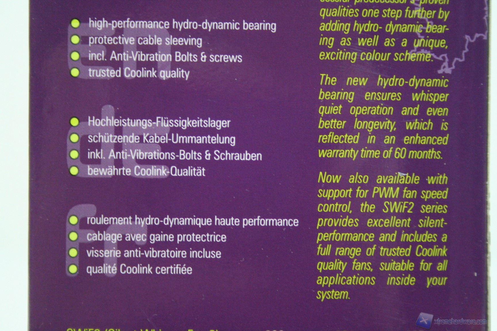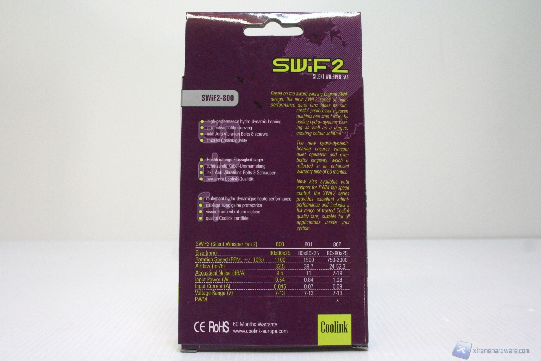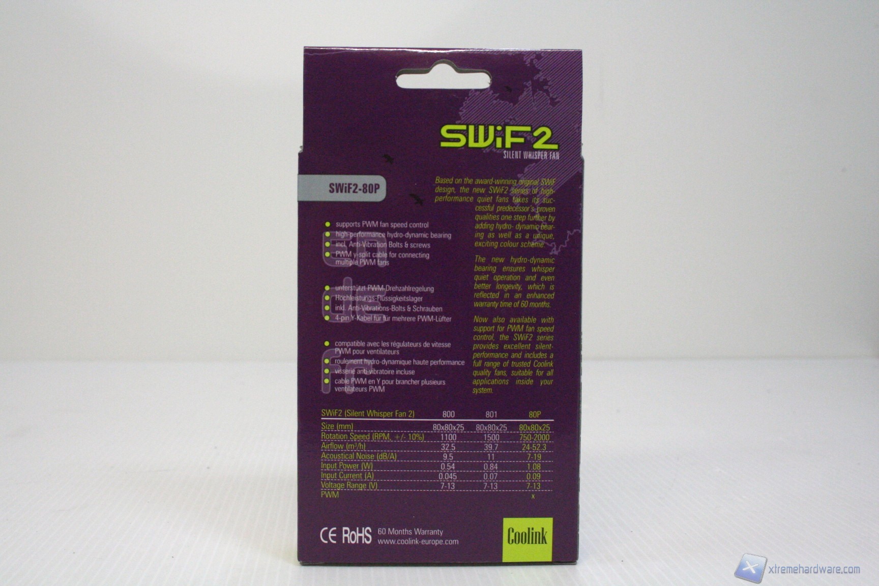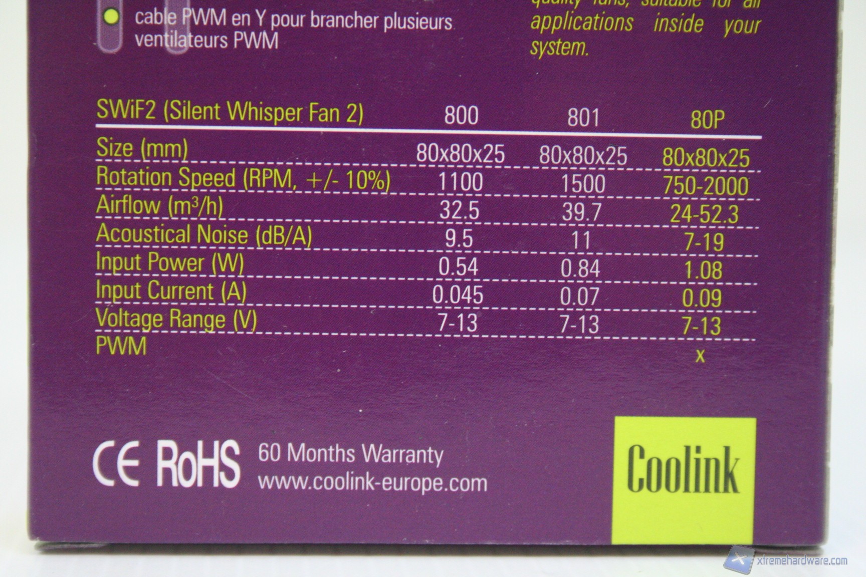 La struttura è standard, eccetto la colorazione verde limone scuro delle pale, che sono specifiche per la ventilazione di case e quindi non molto appropriate per dissipatori (anche se per questa tipologia è irrilevante). Il motore è di grandi dimensioni e la funzionalità PWM è specifica solo per il modello 80P. Non è noto l’MTBF, se non che è riportata la presenza dell’Hydro-dynamic bearing. Nella confezione del modello 80P è inserito un connettore che permette la regolazione appaiata delle ventole, un “PWM split cable”, simile quindi alle soluzioni Arctic Cooling. Il numero delle pale, come il CFM e la pressione statica sono standard. Il telaio non presenta particolarità degne di nota e le pale non sono removibli. Il target di utenza è specifico per tutti coloro che necessitano di ventole generiche per la sostituzione, o il potenziamento, di quelle in un cabinet o dissipatore low profile. La rumorosità non sarà una caratteristica di questi modelli, anche se ovviamente a 2000RPM il modello 80P comincia a farsi sentire.
