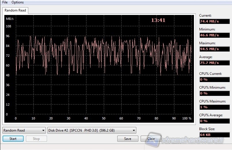 The last test we performed uses the AIDA software. We selected the RANDOM READ test. The results do not differ from other tests performed previously, AIDA gives us further confirmation of the good overall performance of the disc that totals an average reading of 75.7 MB/s.