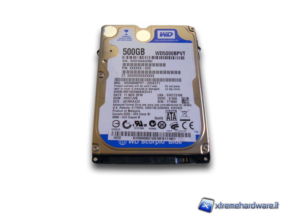 The hard drive is a 500GB Western Digital Scorpio Blue with a good speed/power saving ratio.