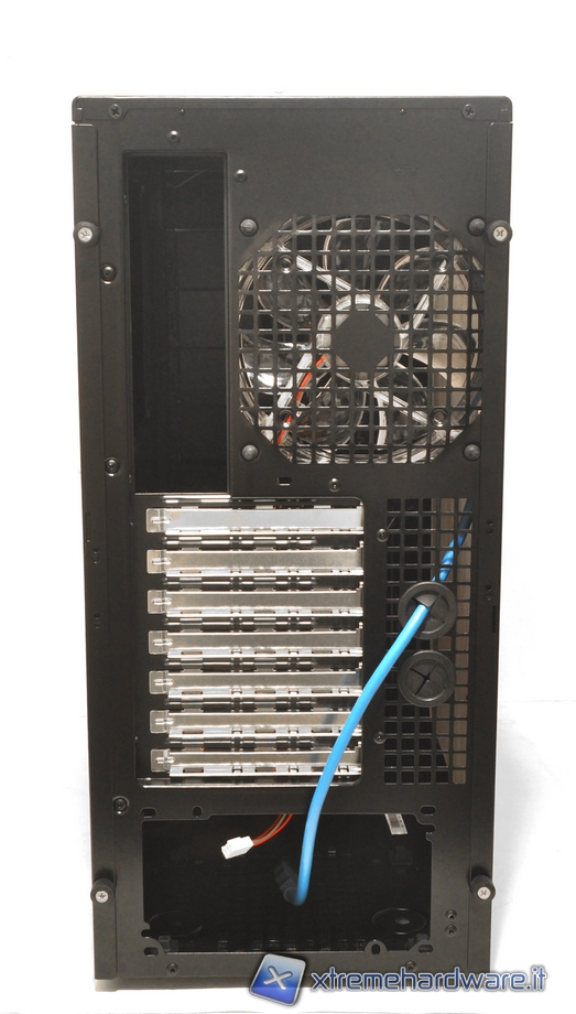 The rear of the case presents an opening for the I/O motherboard mask and on the right a mesh grid with a 120mm fan which has the aim of expelling the hot air out of the case. Notice that the fan is installed with four anti-vibration rubber mounts instead of classic screws as in many other products that are placed on this price range. This is another good choice done by Sharkoon to minimize noise.