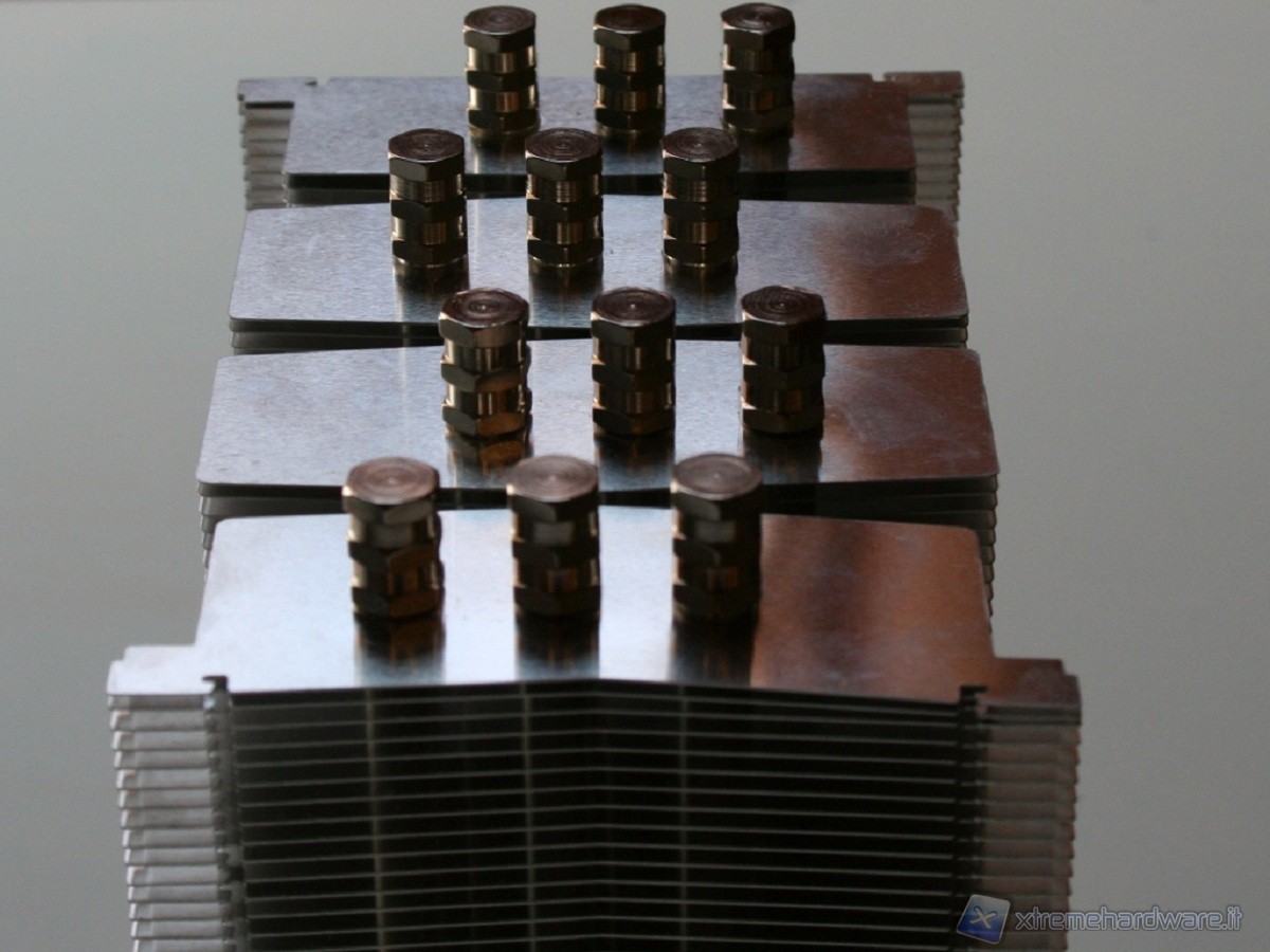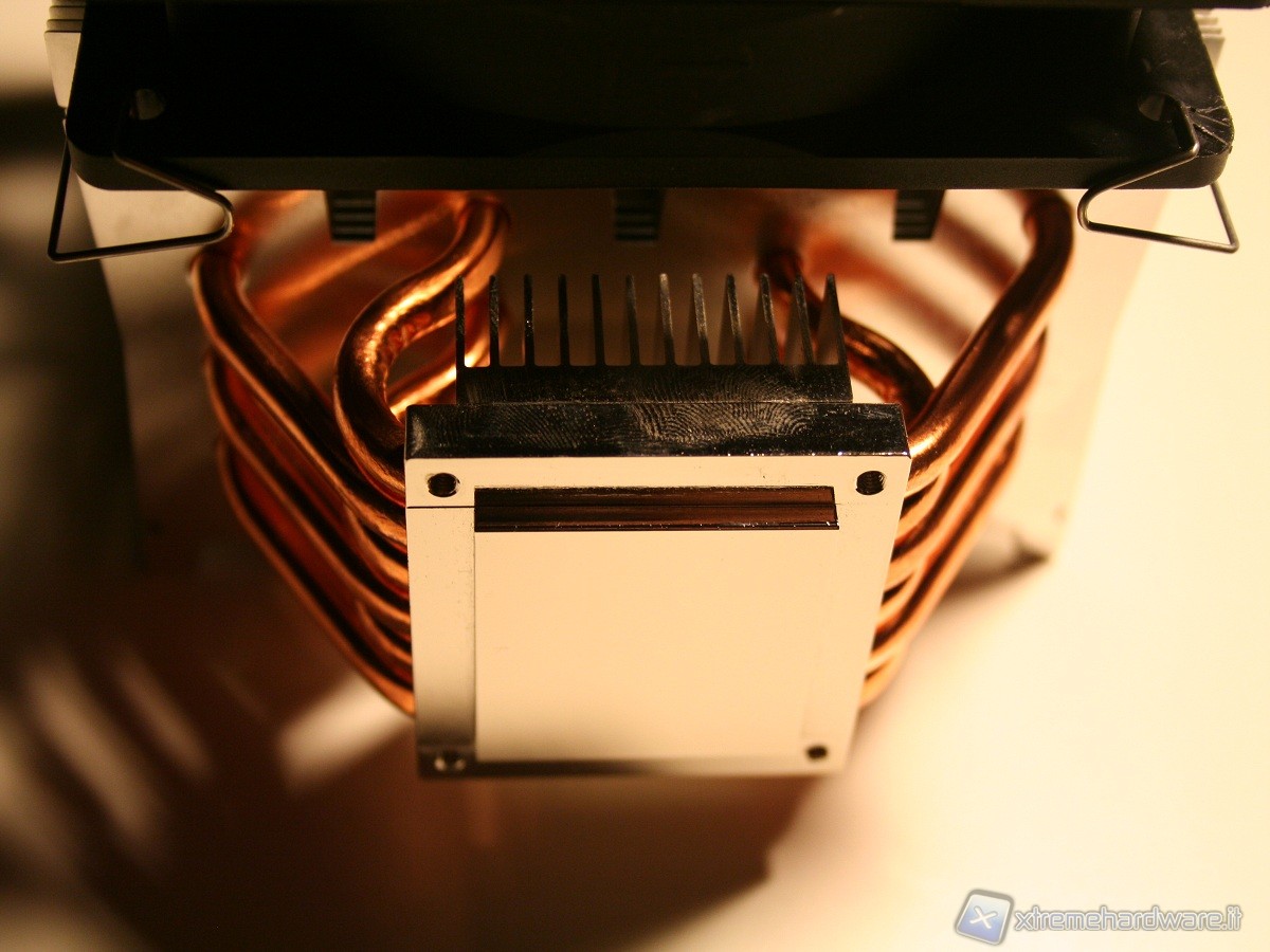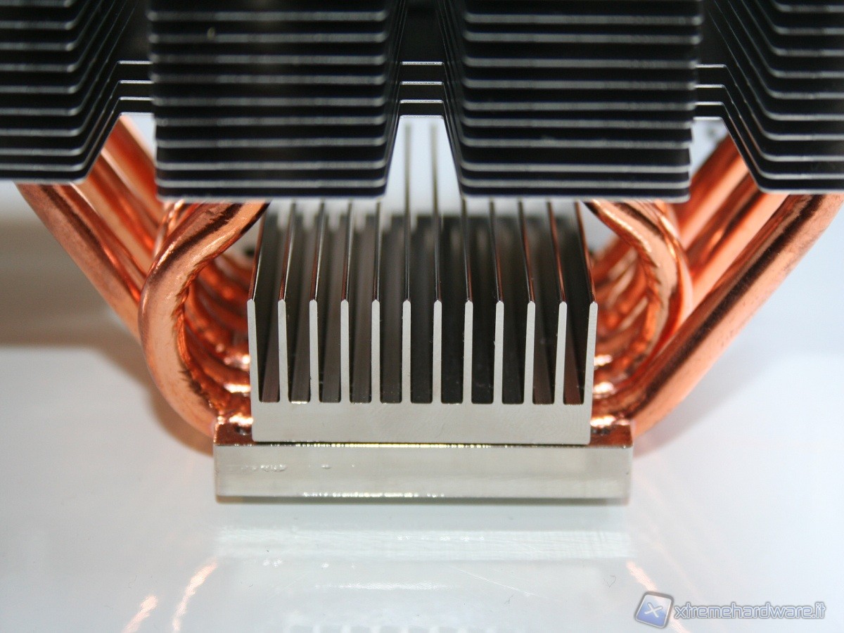 There are no anti-vibration rubber mountings for the fan and the heatsink is not designed to improve the dissipation of the components of the motherboard or RAM, but this is a peculiarity of all the tower heat-sinks whose objective is to maximize the efficiency taking advantage of the cooler air flows inside the cabinet. Note carefully that the fan is slightly detached from the middle part of the dissipating body: this, together with the small size of the engine of the Slip Stream fan, allows a homogenous flow through the cooler, avoiding the classical vacuum in the central part due to the "shadow" of the engine.