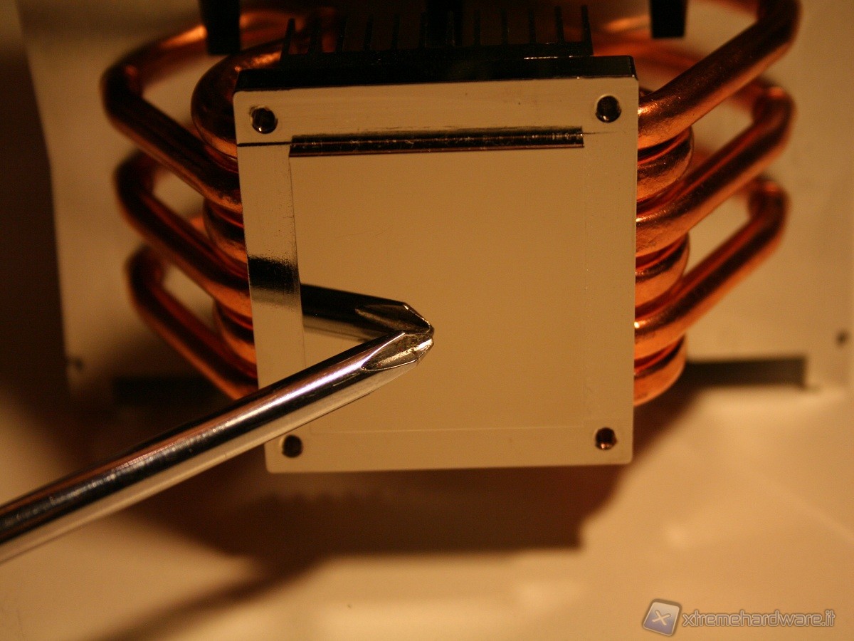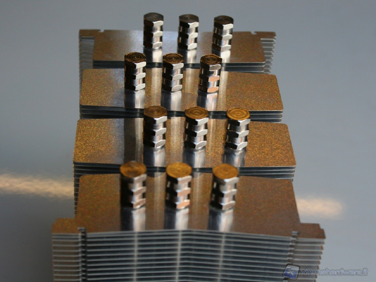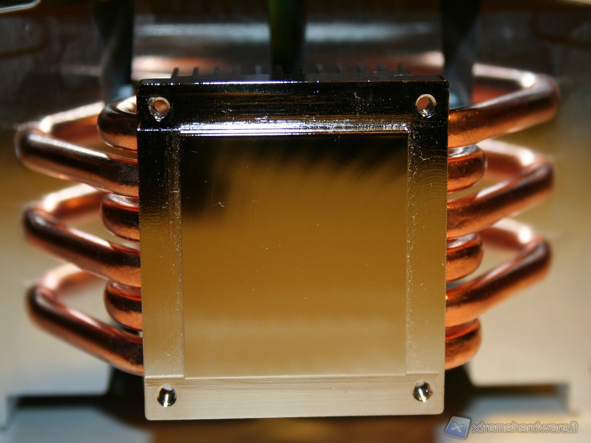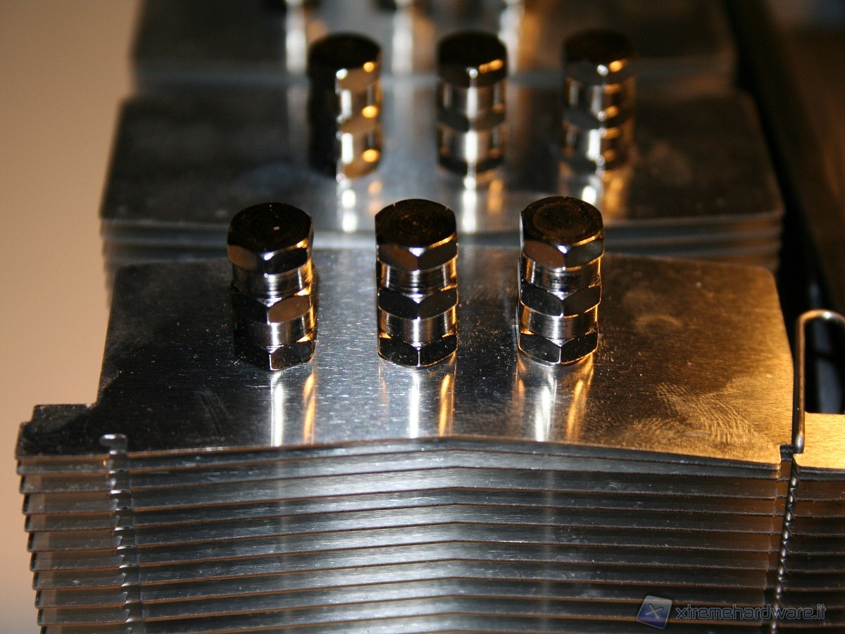 There are no anti-vibration rubber mountings for the fan and the heatsink is not designed to improve the dissipation of the components of the motherboard or RAM, but this is a peculiarity of all the tower heat-sinks whose objective is to maximize the efficiency taking advantage of the cooler air flows inside the cabinet. Note carefully that the fan is slightly detached from the middle part of the dissipating body: this, together with the small size of the engine of the Slip Stream fan, allows a homogenous flow through the cooler, avoiding the classical vacuum in the central part due to the "shadow" of the engine.