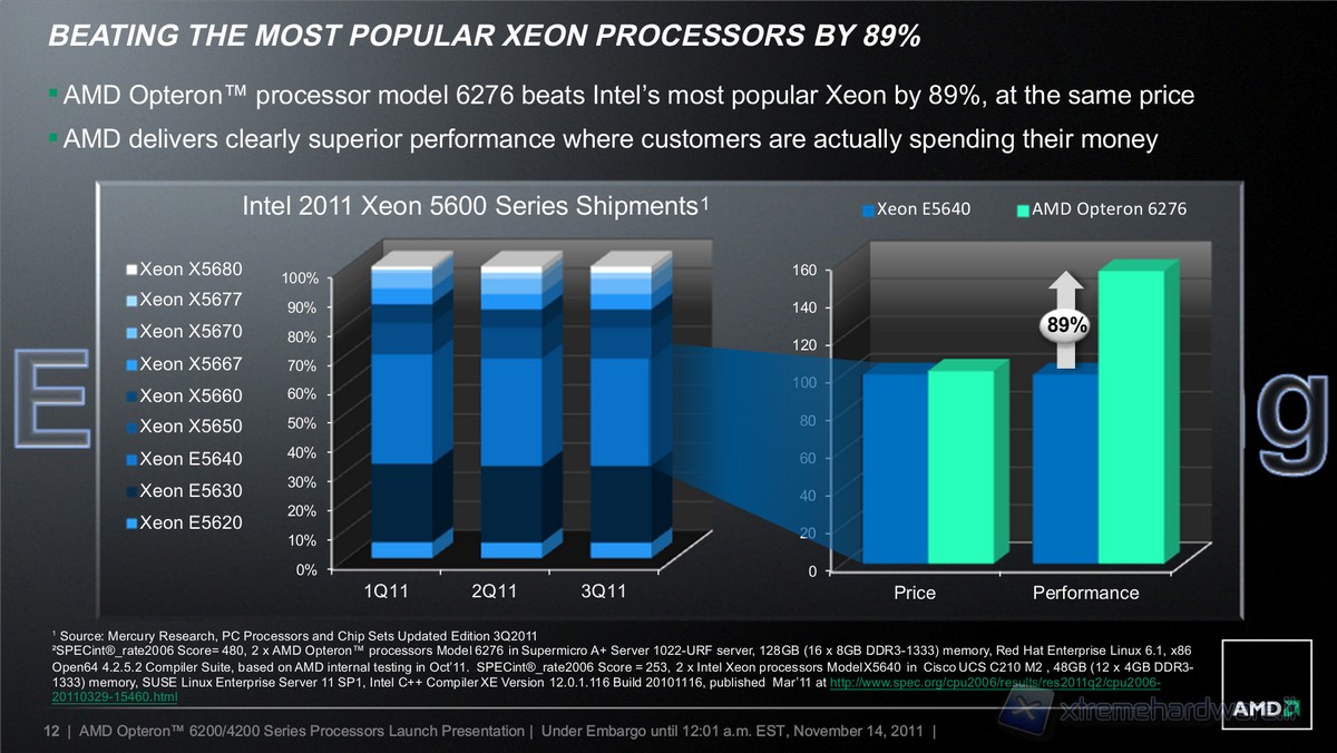In the greater volume market segment, the new generation AMD Opteron achieved an 89% performance increase in the SPEC tests, at the same CPU cost (Xeon E5640, against Opteron 6276).