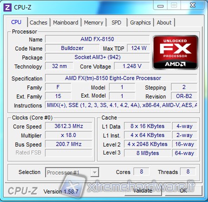 CPU-Z correctly reports the characteristics of this CPU: base clock of 200MHz, 18x multiplier for a default frequency of 3.6 GHz, 8 logical and physical cores.