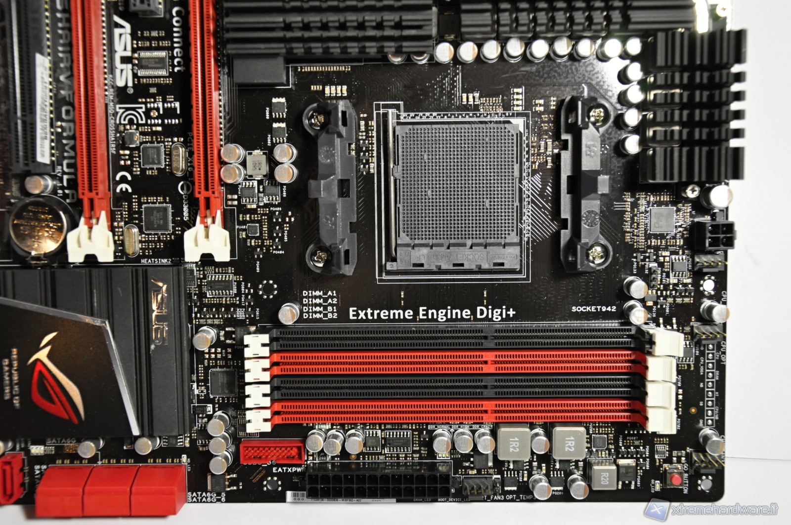 The layout is very neat and innovative and is separated from the traditions so far followed. While the color scheme is classic and always found in other ROG models, a clear advantage in terms of space around the socket is visible on the ASUS Crosshair V Formula . The availability of space on one hand makes more permissive in the choice of the heat sink for the CPU and the other hand let you use a simpler and more effective insulation when you run them under cold overclocking tests. Surely you've noticed that the area at the left of the socket is free and is devoid of classical cooling flange covering the 990FX because that was moved over on the same horizontal line of the power dissipation of the chip, connected by a central channel of Heat Pipe to maximize the dissipation of heat from warmer areas to cooler areas.