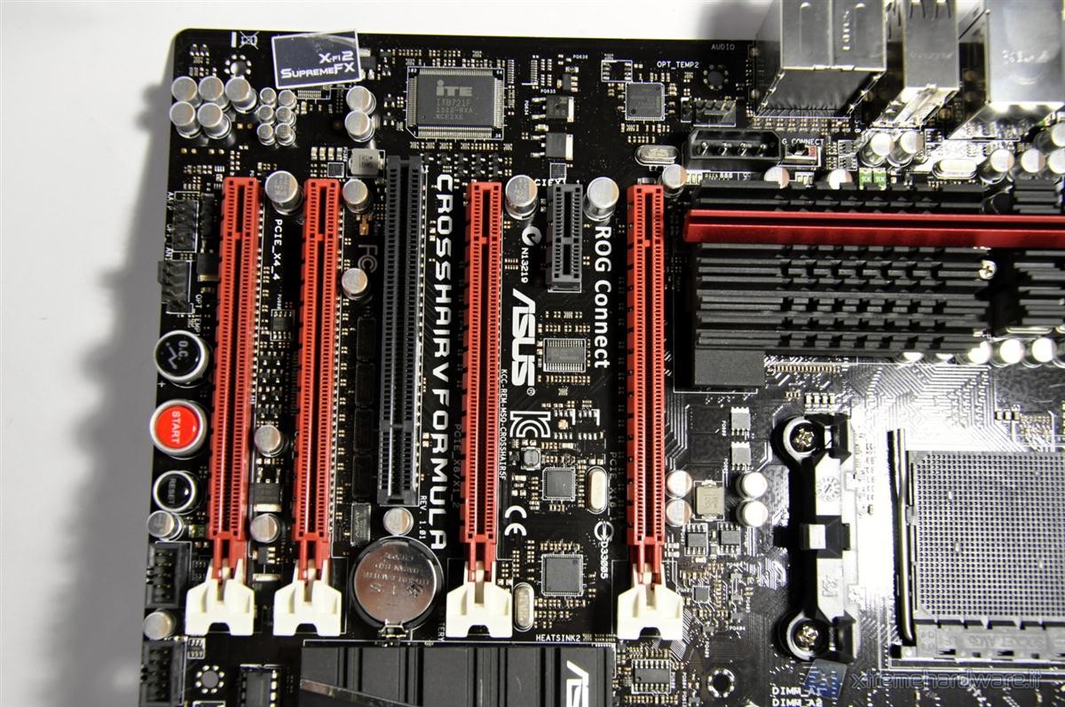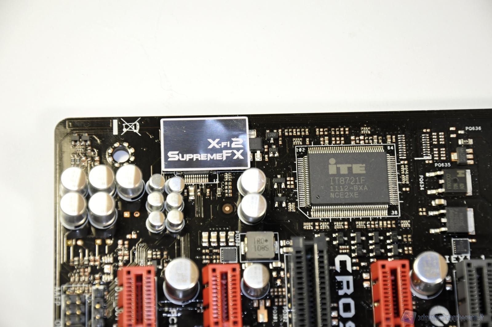 Highlighted, covered by the adhesive, the ASUS Crosshair Formula V has a dedicated audio chip from Creative, the X-Fi 2 SupremeFX signal processing for high-definition audio.