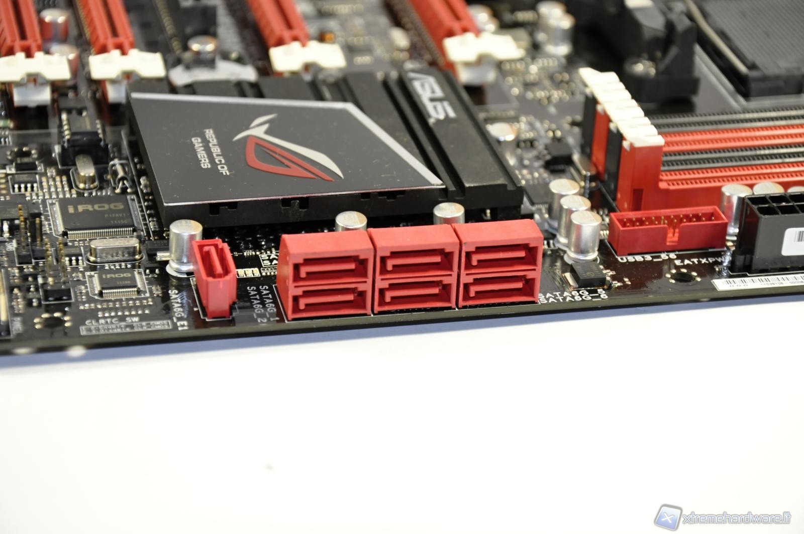 In the picture an elegant passive heat sink above the SB950 southbridge. Below, the support chip for iROG technology for system overclocking.