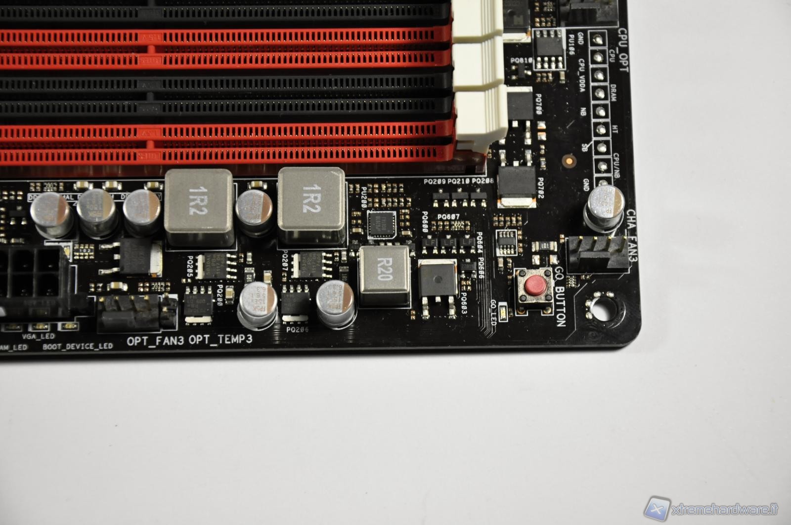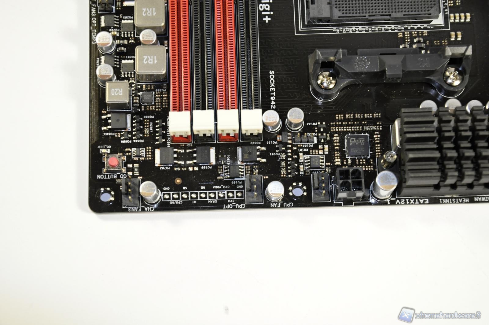 Framed in the top the RAM slots distinguished by color, for installing DIMMs in pairs to support dual channel. Below, along the boundary line, the reading points of the various voltages of the main chips present on the Mainboard such CPU, RAM, NB, SB, etc.