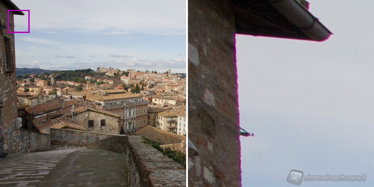 Come tutte le lenti, anche questo obiettivo soffre, in determinate condizioni, di aberrazione cromatica. Soprattutto gli obiettivi zoom, diversamente da quelli a focale fissa, pagano la loro praticità con un compromesso sulla qualità, alle focali estreme. L’immagine sotto, che mette in evidenza il purple fringing, è stata scattata a 15mm. Il fastidioso fenomeno è presente solo nelle zone periferiche dell’immagine, e solo nei punti di maggiore contrasto. Tuttavia, anche se è facilmente rimovibile in fase di post-produzione, è un dettaglio decisamente negativo da trovare nelle nostre foto. Purtroppo, come accennato sopra, per limitare questo effetto è necessario orientarsi su obiettivi a focale fissa, che solitamente sono ottimizzati per combattere l’aberrazione cromatica.