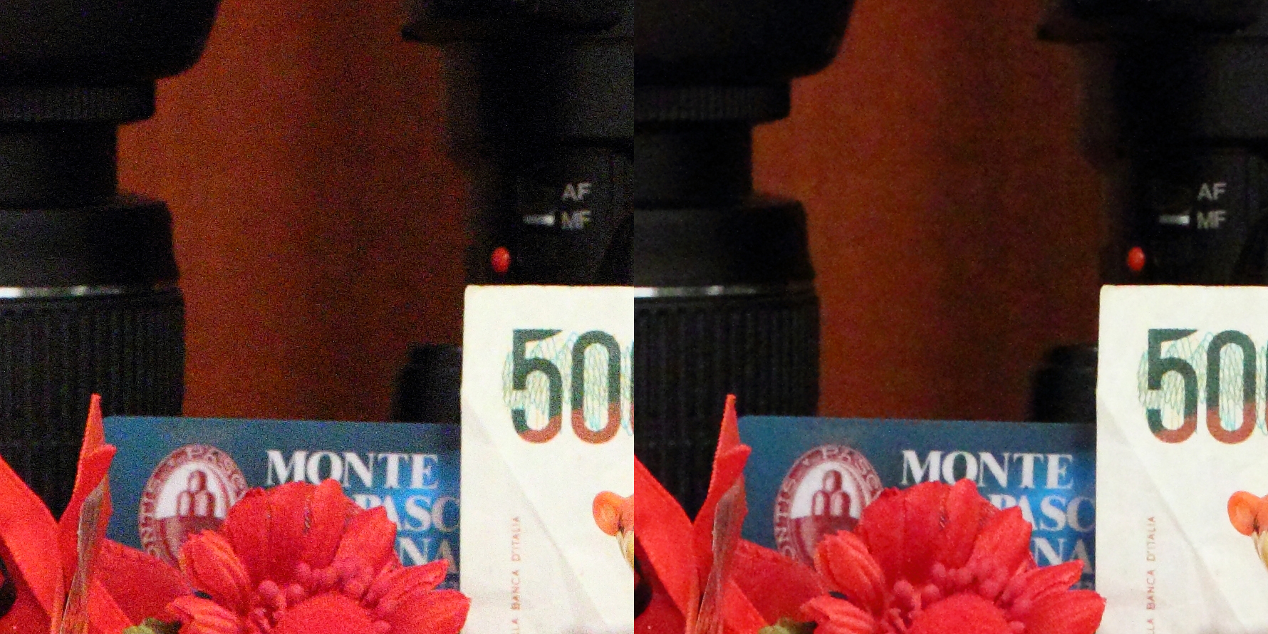 La fotocamera è dotata di molte regolazioni, tra le quali sono presenti anche quelle per la riduzione del rumore ad alti ISO, e la riduzione del rumore per scatti a lunga esposizione. Le immagini sotto sono state scattate per valutare l’efficacia di queste due regolazioni, oltre che per valutare le prestazioni del sensore agli alti ISO. Le foto, divise per ISO, sono così composte: sulla sinistra la versione con nessuna delle due regolazioni attiva; sulla destra la versione con entrambe le regolazioni attive. Come è facilmente comprensibile dal test, il rumore diventa assolutamente ingestibile a partire da ISO 6400 in poi. L’algoritmo di riduzione del rumore presente nel firmware della fotocamera lavora egregiamente, ma ne sconsigliamo l’utilizzo in favore di più performanti filtri utilizzabili in post-produzione (il migliore tra quelli provati risulta essere quello di Photoshop CS5, ma anche quello di Digital Photo Professional, fornito con la 550D, fa il suo dovere).