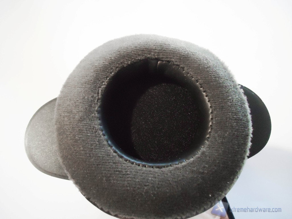 Le cuffie presentano padiglioni molto grandi e caratterizzati da una forma particolare, infatti non sono rotondi come la maggior parte degli headset ma presentano delle estensioni laterali dove sono contenute le casse aggiuntive per il surround. I padiglioni sono ben imbottiti e sono foderati con due materiali differenti , la parte a contatto con l’orecchio è rivestita con lo stesso tessuto che troviamo nell’archetto, mentre il restante è ricoperto in pelle.