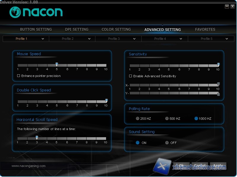 Non poteva mancare il Menù ‘’Advanced Settings’’ dal quale potremo agire sui parametri di accelerazione e sensitività del puntatore, del doppio click, del Polling Rate e di altre impostazioni. Manca però il valore del LOD che comunque misurata di attesta a circa 3mm, quindi un valore elevato per un mouse da gaming.