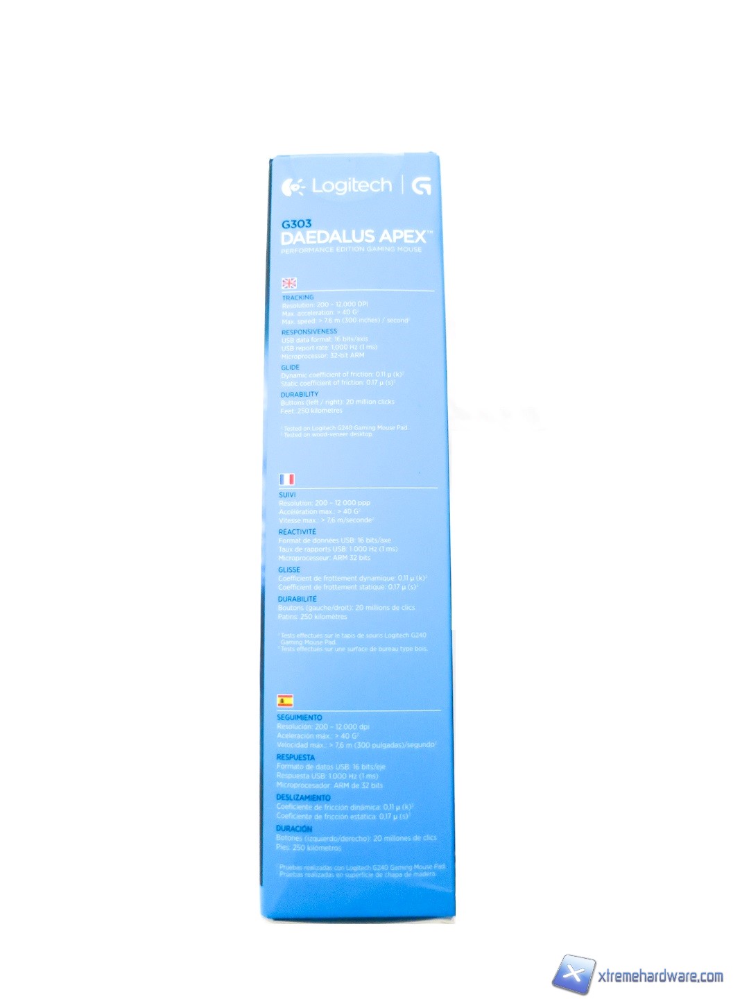 La confezione del Logitech G303 Daedalus Apex richiama i colori della ormai famosa serie Gaming di Logitech e protegge abbastanza bene il prodotto. Anche se lo spessore del cartone è ridotto, internamente è presente una ulteriore protezione in plastica rigida. Informazioni ed immagini del prodotto al solito non mancano.