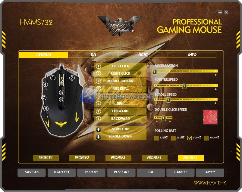 Fatto ciò ed aperto il software ci troviamo di fronte una grafica personalizzata ma spartana con tutte le voci e funzioni a portata di click e divise come sempre in diversi Menù. Nel primo Menù ‘’General’’ troviamo la classica immagine del mouse con i diversi numeri che ci indicano i tasti complessivi presenti sul mouse e la relativa posizione per eventualmente modificare qualche opzione o assegnazione rispetto a quella di default. Infatti a lato possiamo, cliccando con il tasto sinistro, scegliere tra le più svariate opzioni di personalizzazione. Tra i tasti troviamo il numero 4 (il tasto giallo fisico sul mouse) a cui è di default assegnata la funzione Rapid Fire impostabile a seconda delle nostre necessità. Nel Menù ‘’Generale’’ troviamo comunque altre impostazioni quali accelerazione, doppio click, Polling Rate e così via modificabili nonché la presenza di 5 profili personalizzabili e caricabili On-The-Fly tramite i tasti presenti sul mouse.