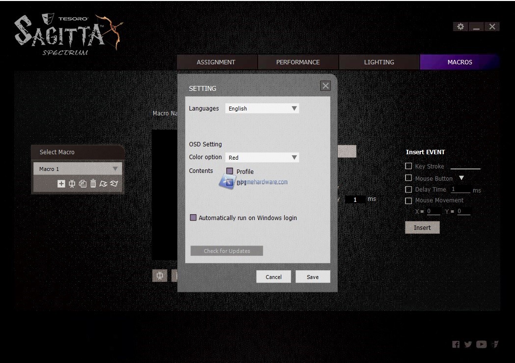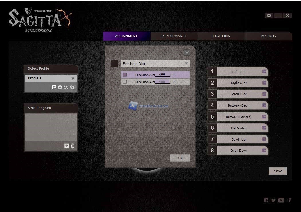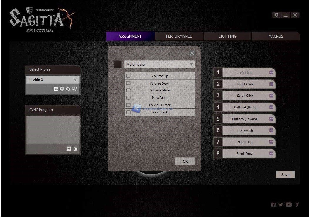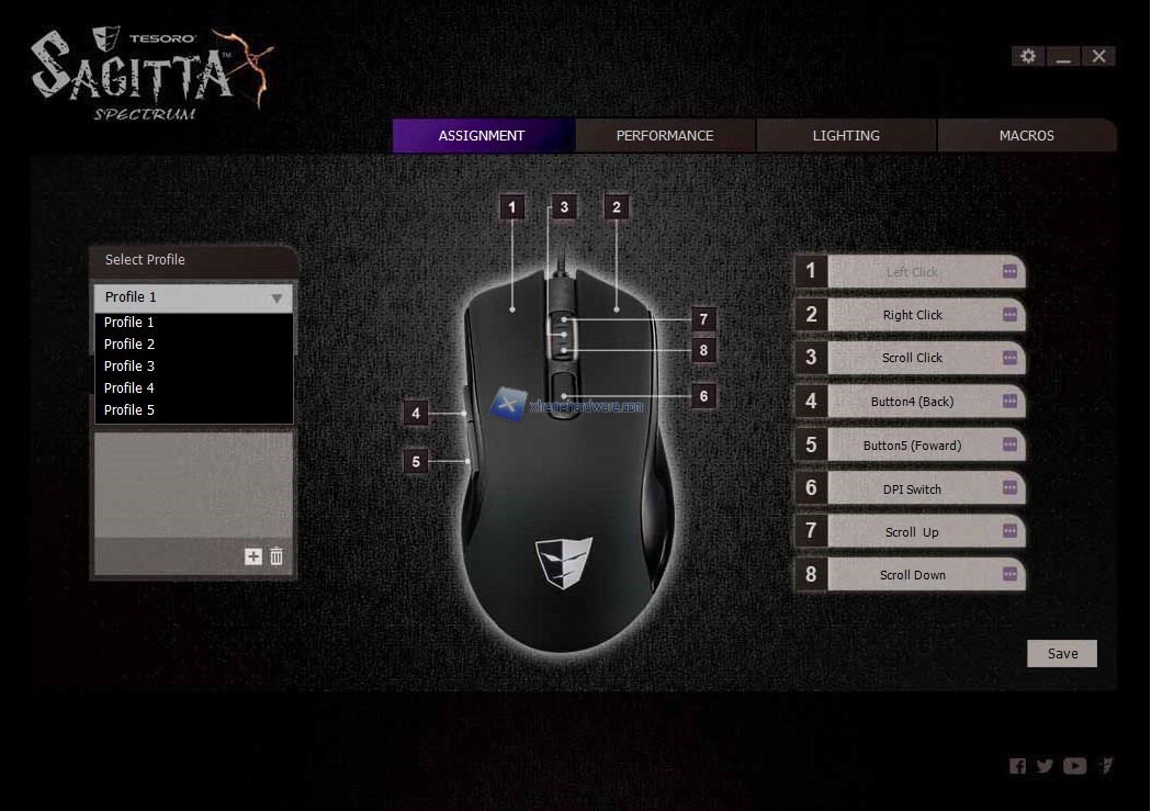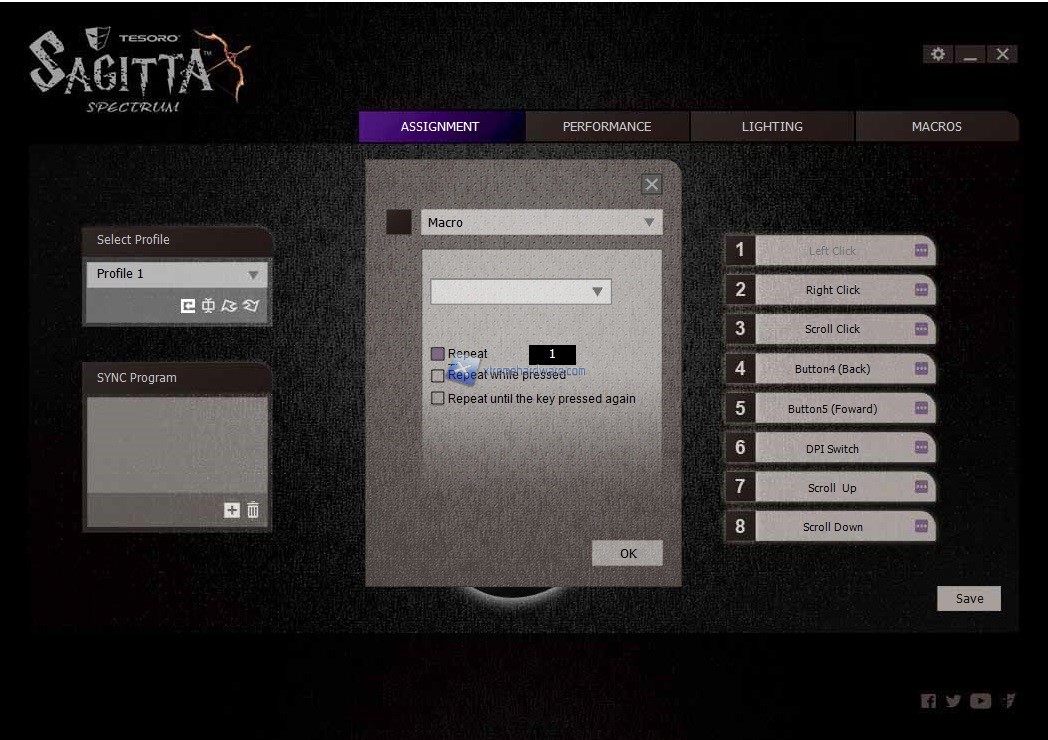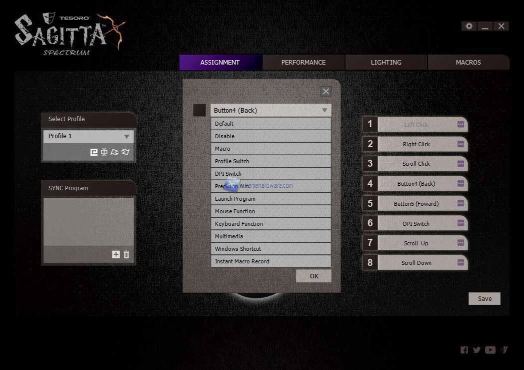 Il software presenta quattro Menù principali. Il primo da cui partiamo è ‘’Assignment’’ che come fa intuire la parola indica la possibilità di modificare gli 8 tasti totali del mouse con altre funzioni. Come sempre potremo agire su funzioni multimediali, desktop o come sempre creare e subito dopo assegnare una data macro. In questo Menù avremo la possibilità di salvare sino a 5 profili con diversi settaggi da richiamare all’occorrenza impostando un tasto dedicato. Infatti come pensavo il singolo tasto presente sul mouse nella parte superiore sarà adibito al cambio dei DPI o per meglio dire Step DPI. Non manca in questo Menù anche la possibilità di ‘’legare’’ un dato profilo ad un programma in modo tale da avere subito caricato quel profilo quando avremo lanciato il gioco o programma.