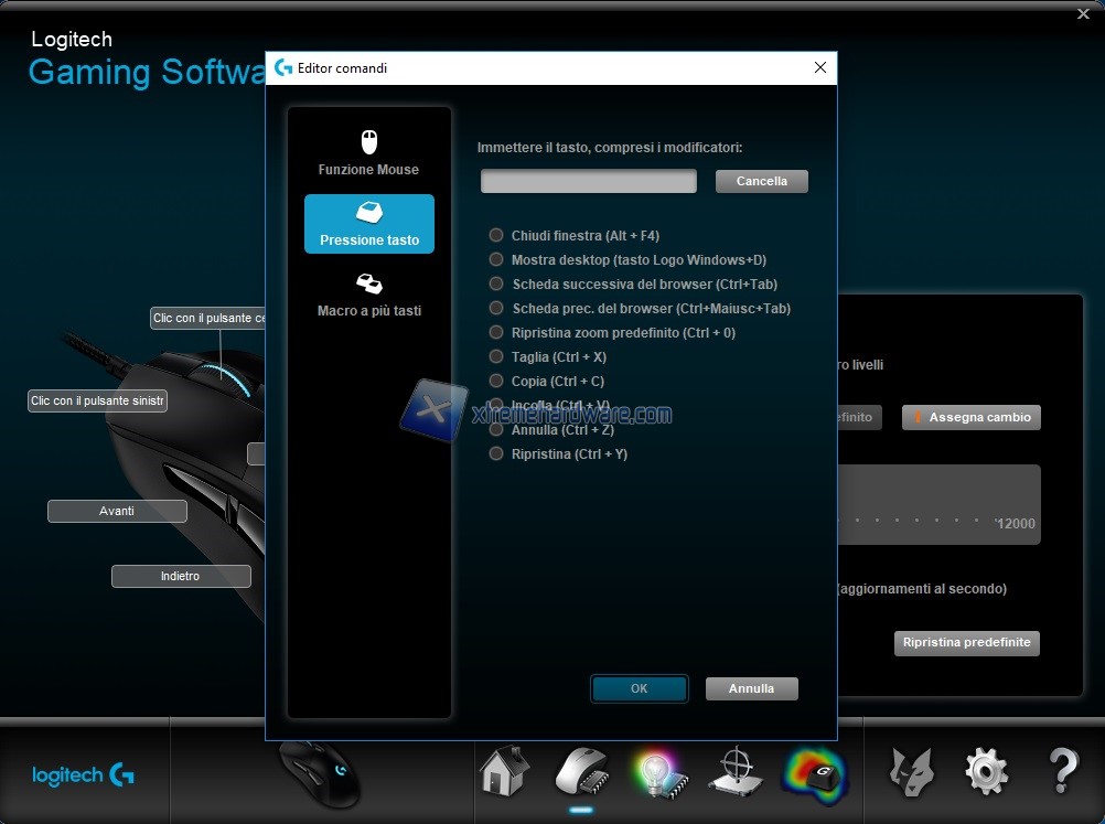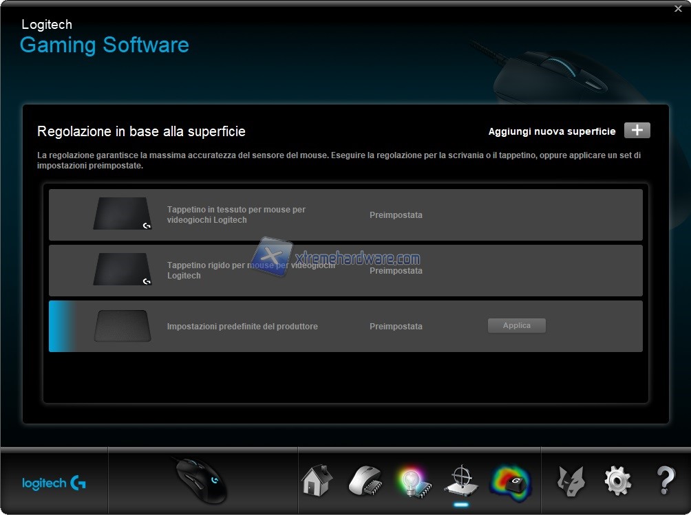 L’icona del mirino invece ci permetterà di calibrare il mouse sulla superficie del mouse. Ovviamente di default sono precaricati i modelli Logitech ma potremo personalizzarlo anche con altri.