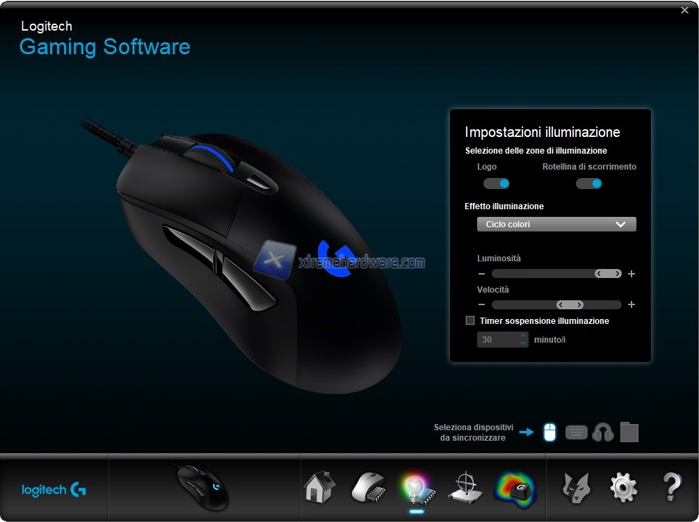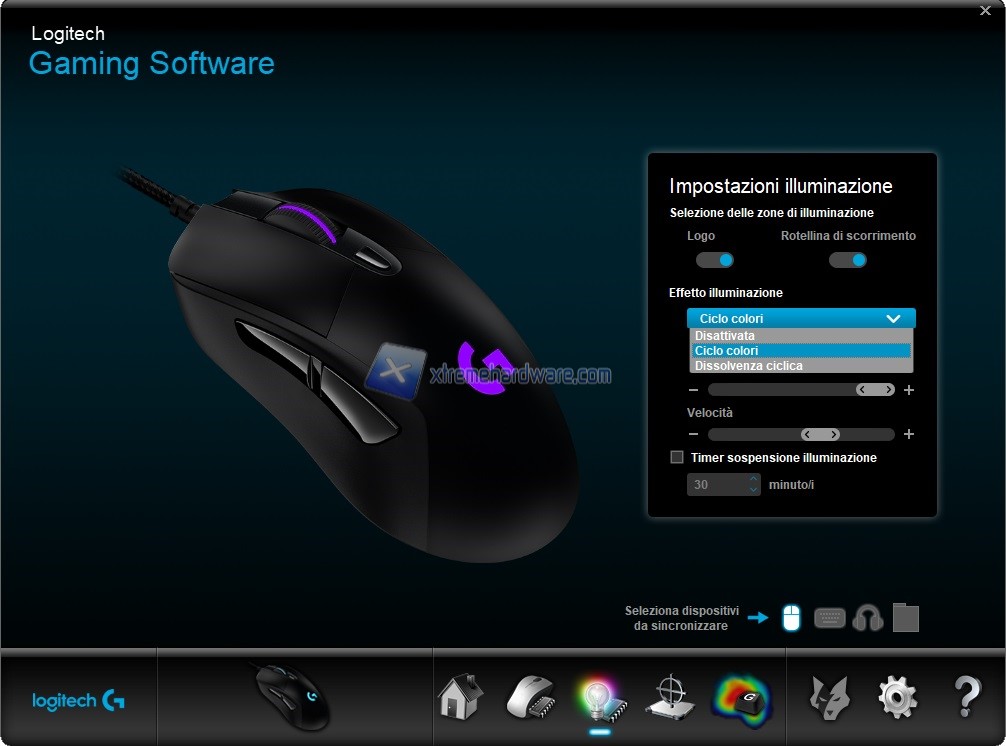 Passiamo all’icona per la personalizzazione della retroilluminazione RGB e relativi effetti. Logitech ci mette a disposizione abbastanza voci per la personalizzazione tra cui la sincronizzazione cromatica tra diverse periferiche compatibili Logitech.