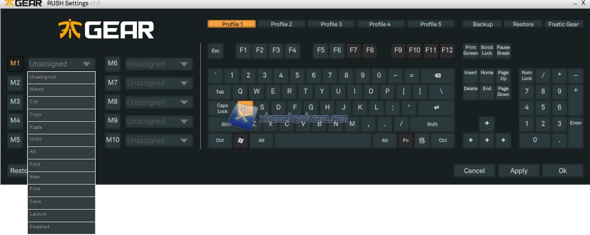 La GUI del software della tastiera RUSH è davvero semplice e immediata. Avremo una grafica personalizzata per il dato prodotto con tutti i riferimenti alla Fnatic Gear. Software inoltre diviso, se così possiamo dire, in due aree di cui a sinistra presente una sorta di tastiera con tasti virtuali denominati M1-M10 e a destra sempre una tastiera virtuale con tutti i singoli tasti fisici presenti sulla tastiera.
