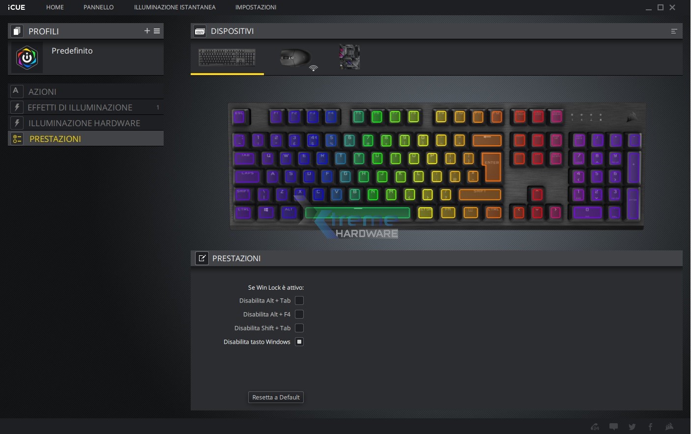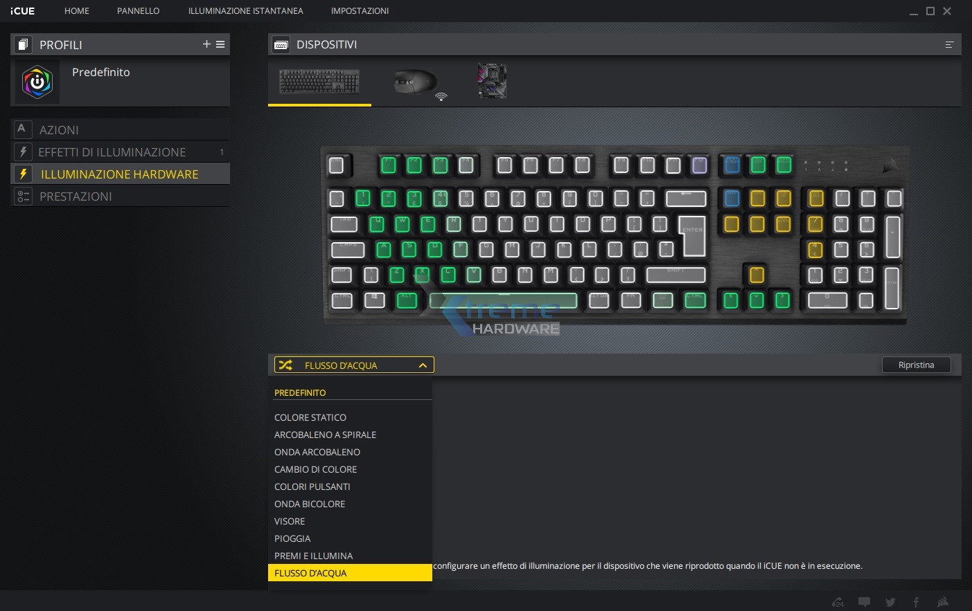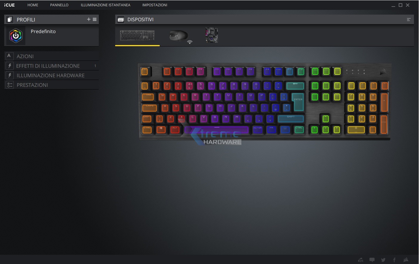 Cliccando sull’icona inerente la periferica di nostro interesse dunque la K60 RGB PRO accederemo ai vari menu per la personalizzazione. Oltre a creare diversi Profili da caricare all’occorrenza troviamo i seguenti menu: Azioni, Effetti di illuminazione, Illuminazione Hardware e infine Prestazioni.