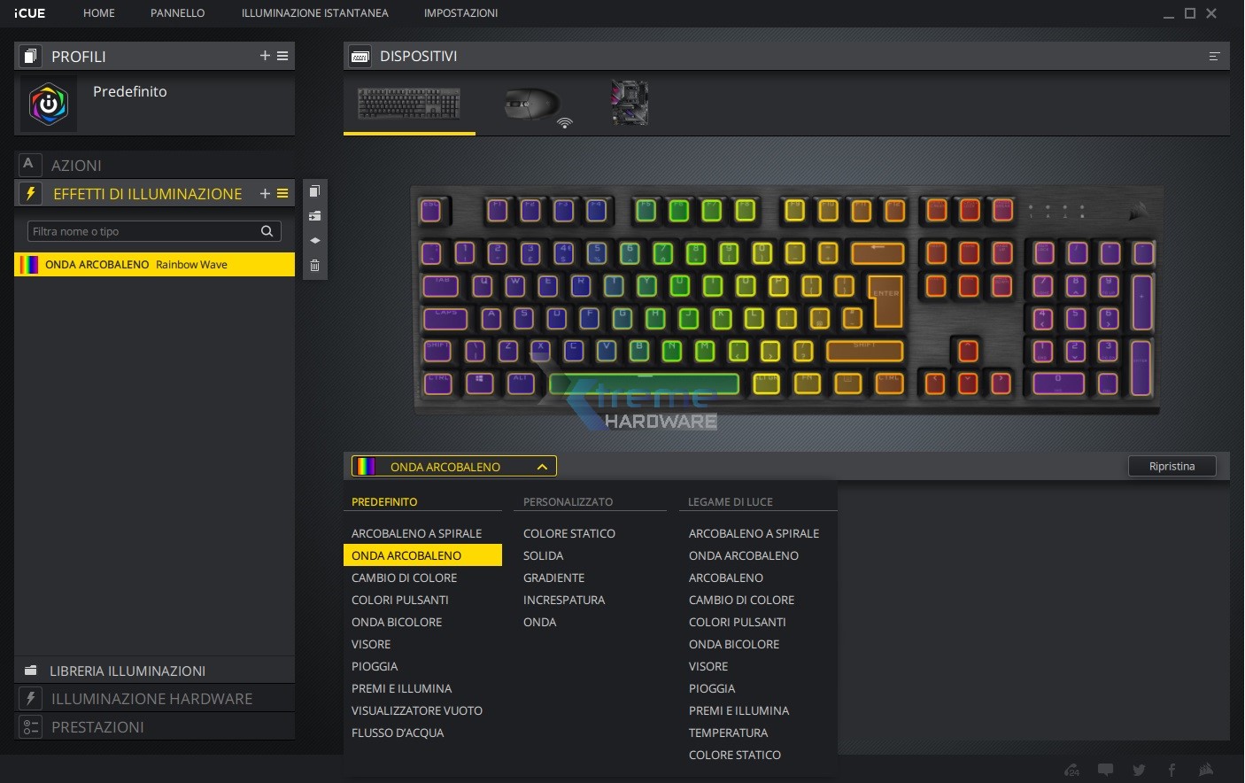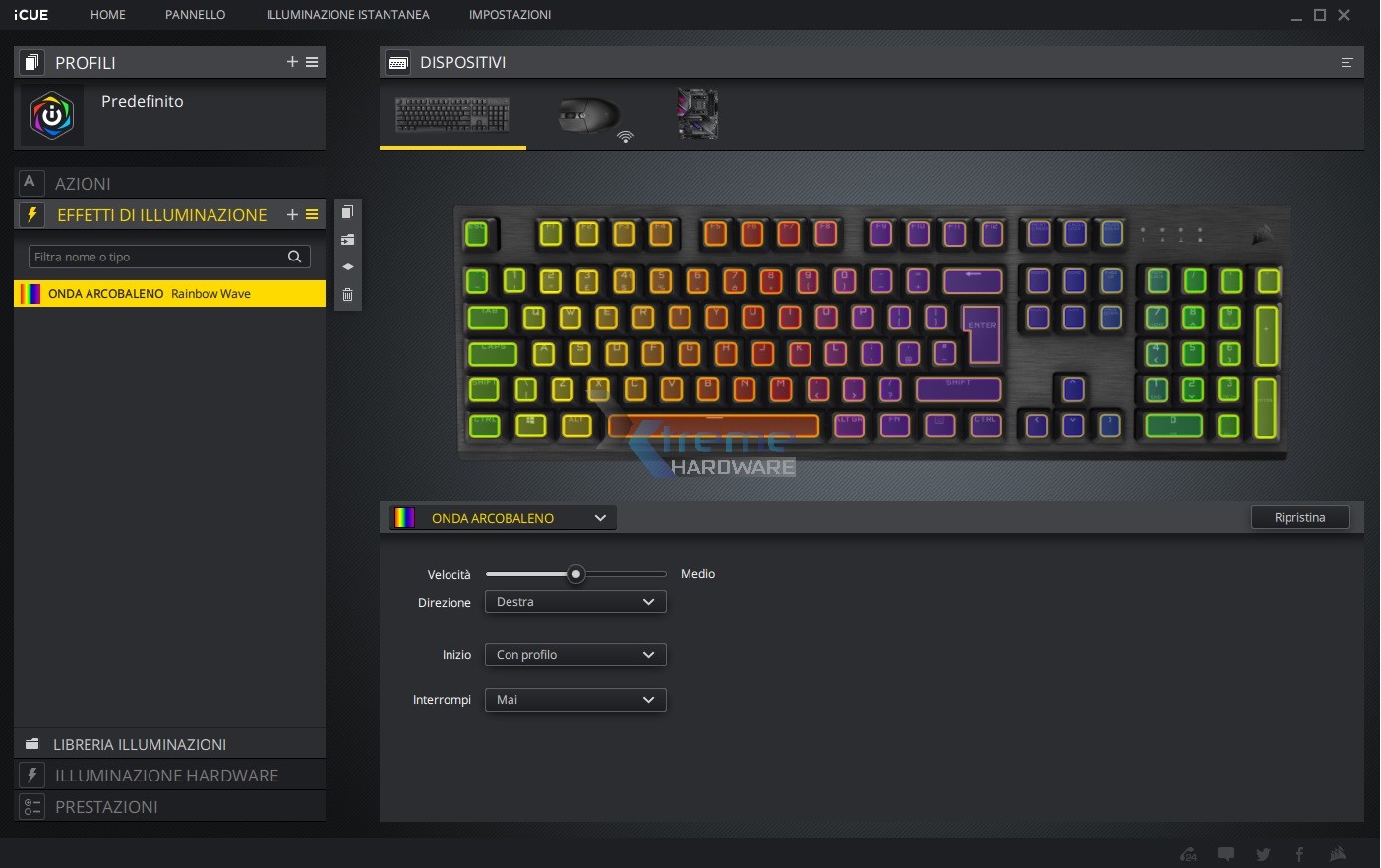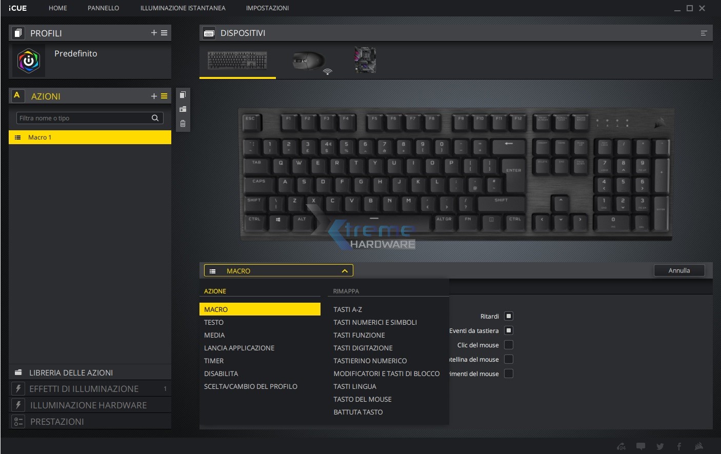 Cliccando sull’icona inerente la periferica di nostro interesse dunque la K60 RGB PRO accederemo ai vari menu per la personalizzazione. Oltre a creare diversi Profili da caricare all’occorrenza troviamo i seguenti menu: Azioni, Effetti di illuminazione, Illuminazione Hardware e infine Prestazioni.