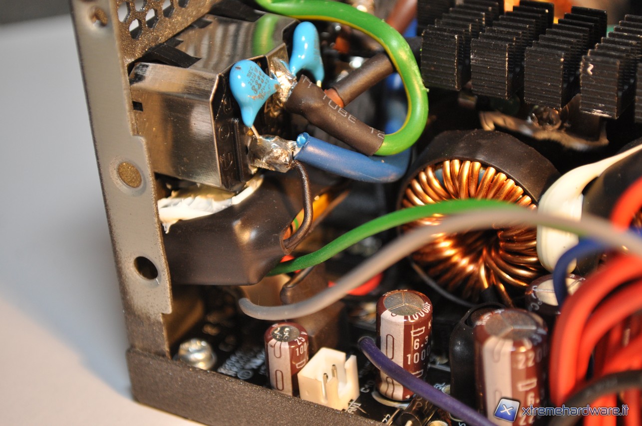Il filtro EMI ha lo scopo di limitare la trasmissione di armoniche ad alta frequenza dell’alimentatore alla linea di distribuzione dell’energia elettrica e di evitare che i disturbi ad alta frequenza provenienti dalla rete creino dei danni all’alimentatore. Nell’immagine sovrastante è possibile notare sulla destra un altro filtro EMI.
