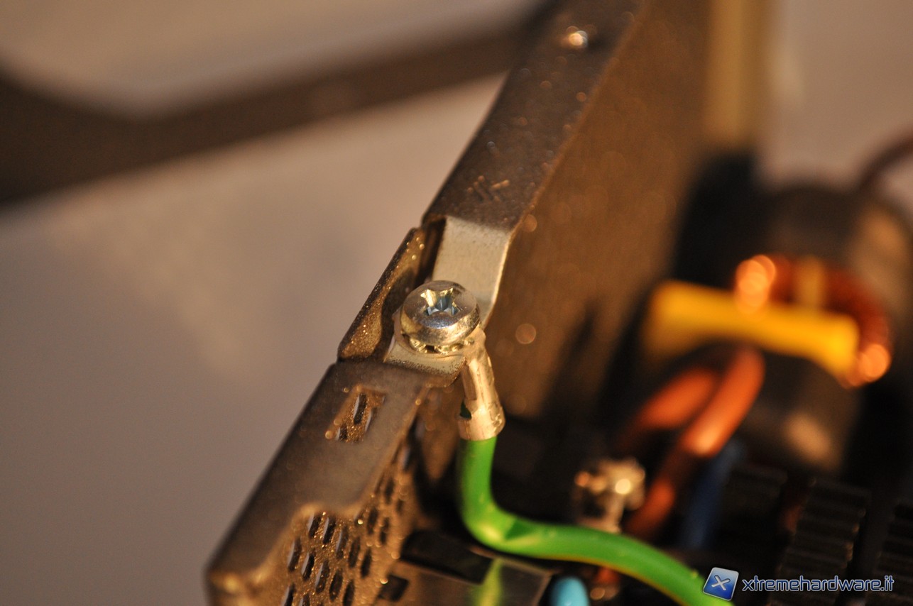 Nella prima delle due immagini possiamo vedere un filtro EMI collegato alla presa IEC-C14 e si può notare ciò da due condensatori circolari di colore blu che si collegano ad un filtro situato più in basso. Nella seconda immagine si può invece notare la vite di messa a terra per la scocca. L’alimentatore monta vari filtri EMI ed è giusto spendere due parole per spiegare il loro funzionamento.