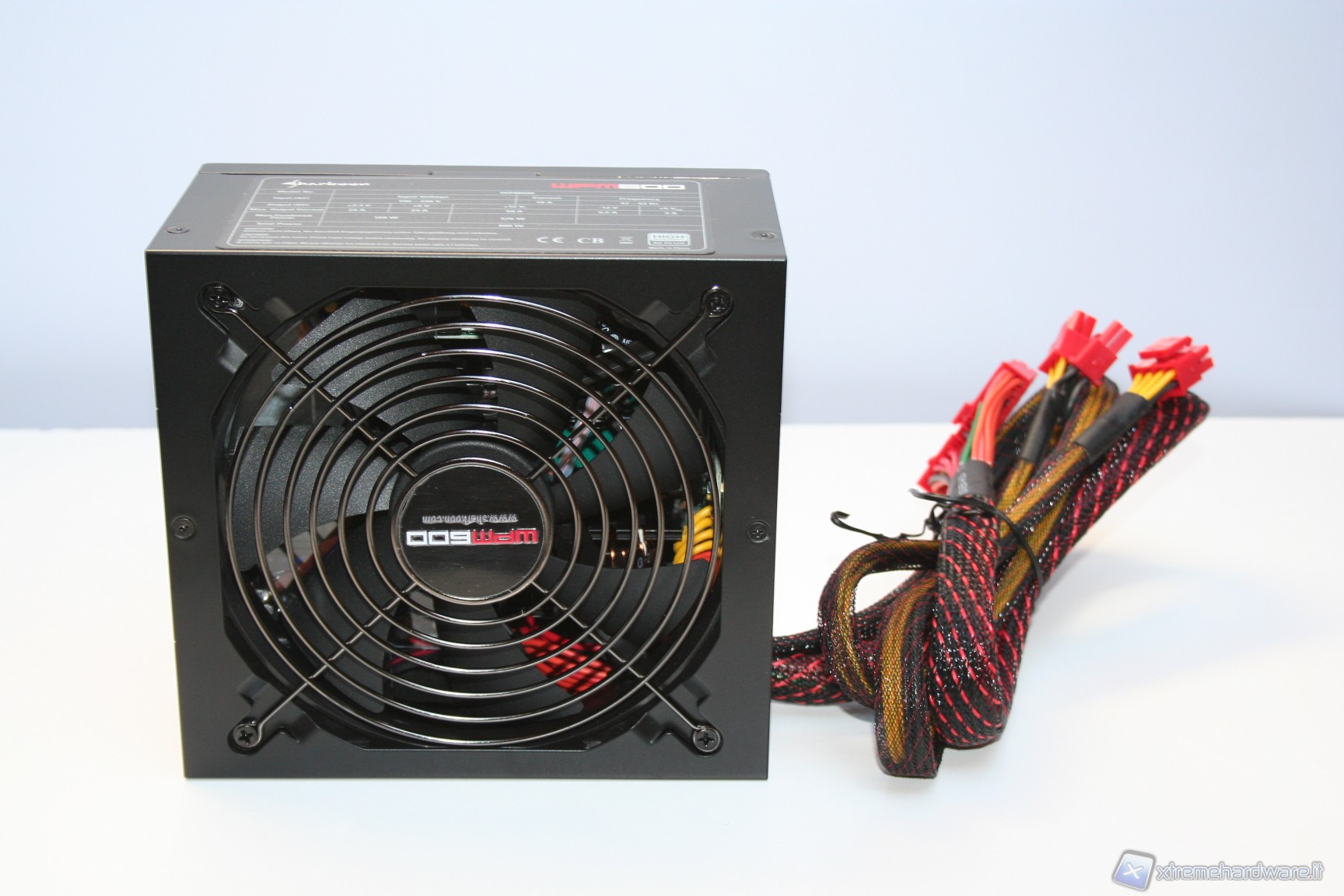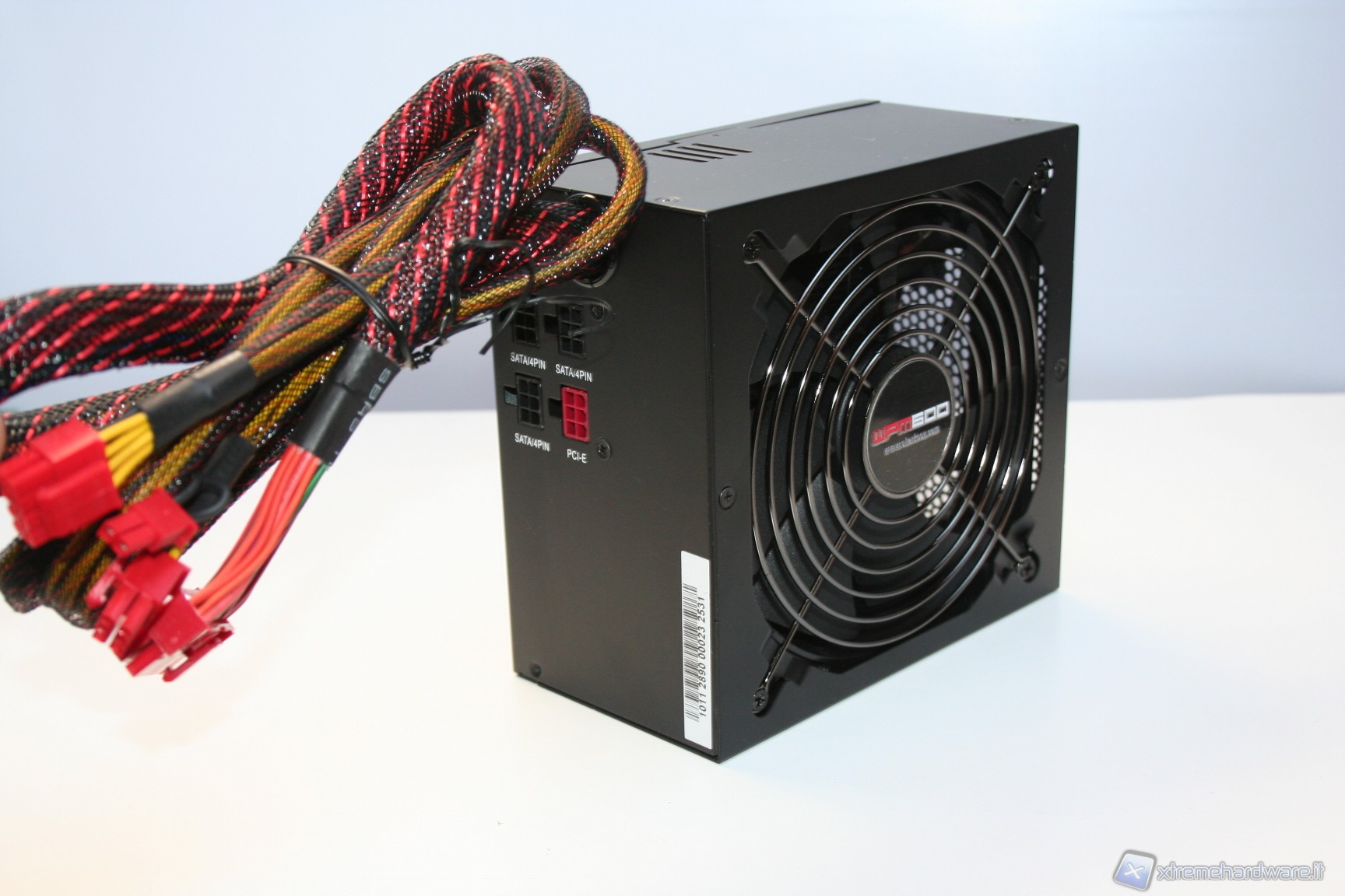 Il design dello chassis, sebbene elementare, ha un aspetto gradevole alla vista e rispecchia le colorazioni del confezionamento esterno; la scocca è di colore nero e presenta una verniciatura di tipo antigraffio. Nella parte centrale inferiore è presente la classica struttura forata con griglia di protezione per la sottostante ventola da 140mm, foro necessario per l’ingresso dell’aria fredda dall’esterno. Di ottimo livello la finitura e non sono presenti sbavature o deformazioni. Una struttura classica ma sostanzialmente di buona fattura. Lo stesso discorso vale per la parte posteriore, dove possiamo trovare le connessioni modulari e per la parte frontale, dove è invece presente la classica griglia a nido d’ape, la presa d’alimentazione IEC 220V ed il pulsante di accensione, di dimensioni standard. Posteriormente invece troviamo i connettori di alimentazione supplementari ed i cavi di alimentazione saldati, che conferiscono una modularità parziale all’alimentatore. Gli attacchi dei cavi addizionali non sono piatti bensì classici a 6 Pin, il che porta ad un ingombro contenuto; lateralmente, su di una vite, è presente un’etichetta che segnala la perdita della garanzia della casa produttrice qualora dovesse essere rimosso o forato, per permettere lo smontaggio della scocca o l’eventuale sostituzione della ventola in dotazione, cosa presente nella quasi totalità degli alimentatori attualmente in commercio. Lo sleeving dei cavi, seppure lasci scoperta la parte terminale, è di buona fattura e le maglie sono molto fitte, a differenza di altri modelli della concorrenza, dove invece può capitare che si possono rovinare più facilmente. A fine corsa è presente del materiale termorestringente, anche se i cavi rimangono scoperti dallo sleeving per una buona lunghezza, quindi coloro i quali apprezzano anche l’estetica di questa parte, rimarranno delusi.