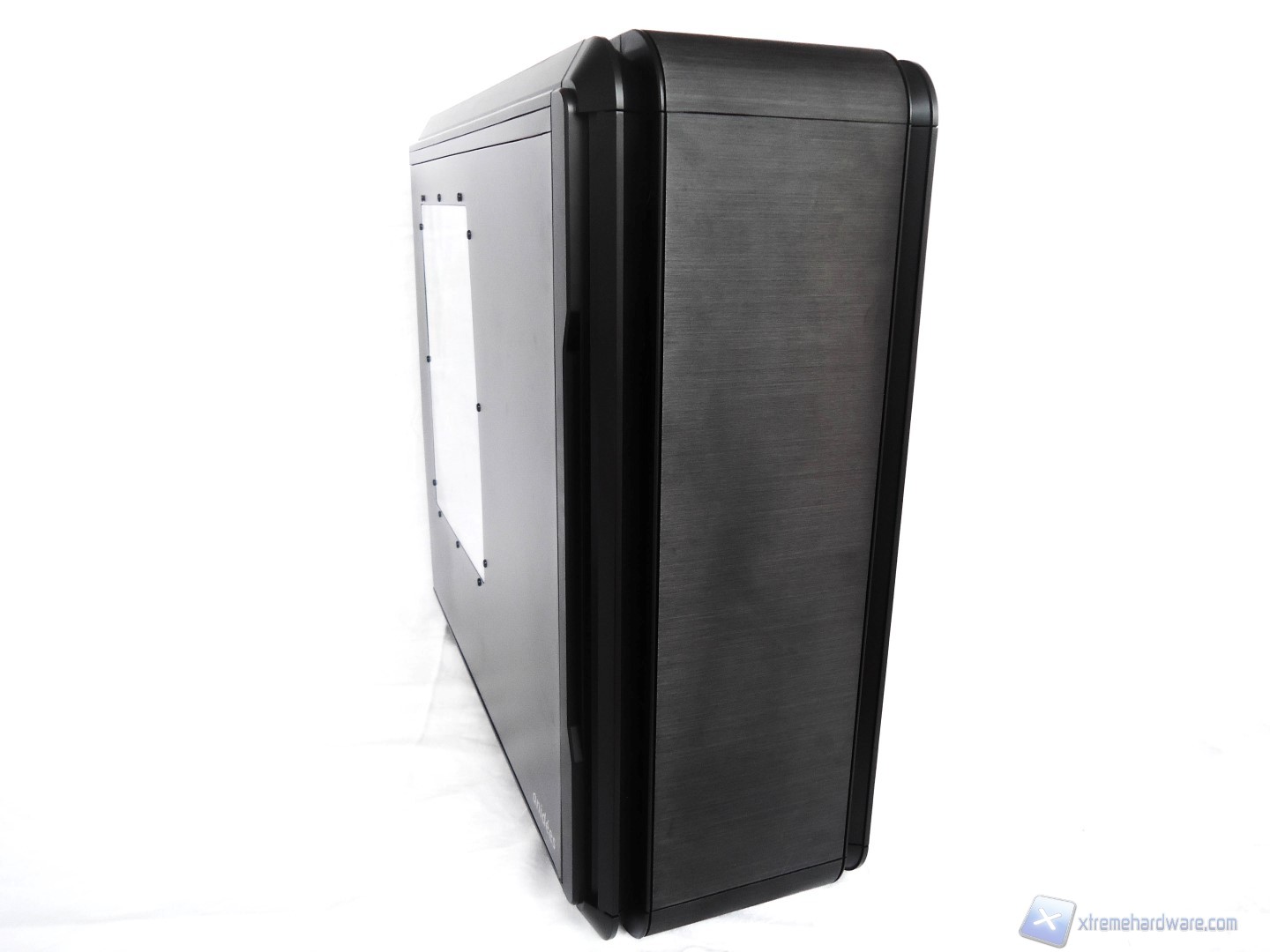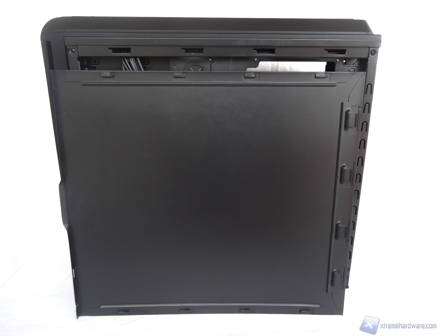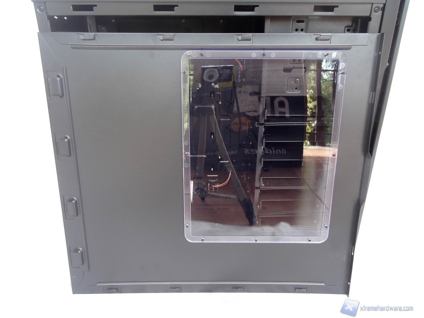 Come è facilmente visibile dalle foto, la paratia destra è classica, cioè priva di ogni foro o altre modifiche, quindi è completamente planare. Lo stesso non si può dire per la paratia sinistra che oltre a presentare nel nostro caso una finestra di discrete dimensioni che ci permette di visionare l’hardware installato, presenta anche il nome dell’azienda stampato in basso a destra. Le paratie sono di buona qualità e si flettono poco quando le prendiamo in mano. La verniciatura è di buona fattura e nonostante sia abbastanza ruvida al tatto non impedisce che le impronte rimangano sulla stessa. La rimozione delle paratie è facilitata dalla presenza di viti tool-less, ormai presenti anche nei case più economici.
