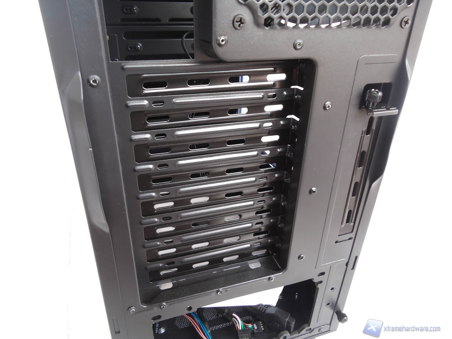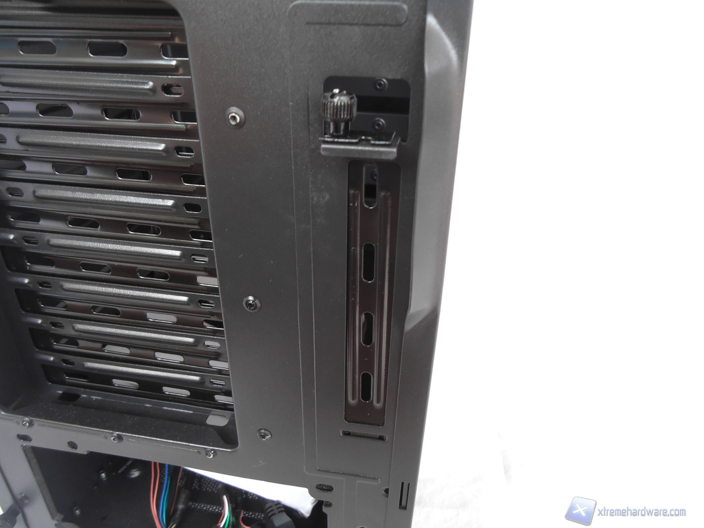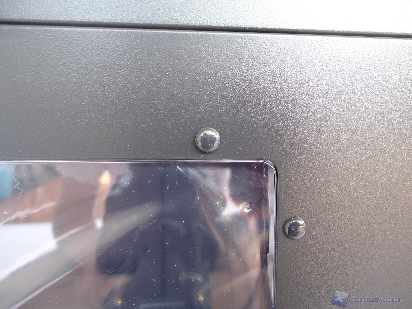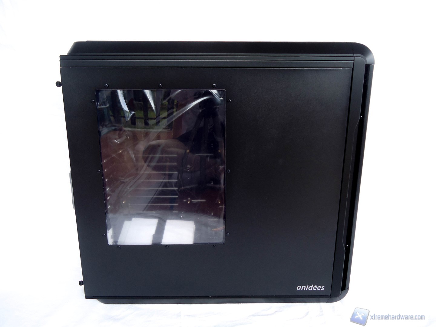 Come è facilmente visibile dalle foto, la paratia destra è classica, cioè priva di ogni foro o altre modifiche, quindi è completamente planare. Lo stesso non si può dire per la paratia sinistra che oltre a presentare nel nostro caso una finestra di discrete dimensioni che ci permette di visionare l’hardware installato, presenta anche il nome dell’azienda stampato in basso a destra. Le paratie sono di buona qualità e si flettono poco quando le prendiamo in mano. La verniciatura è di buona fattura e nonostante sia abbastanza ruvida al tatto non impedisce che le impronte rimangano sulla stessa. La rimozione delle paratie è facilitata dalla presenza di viti tool-less, ormai presenti anche nei case più economici.