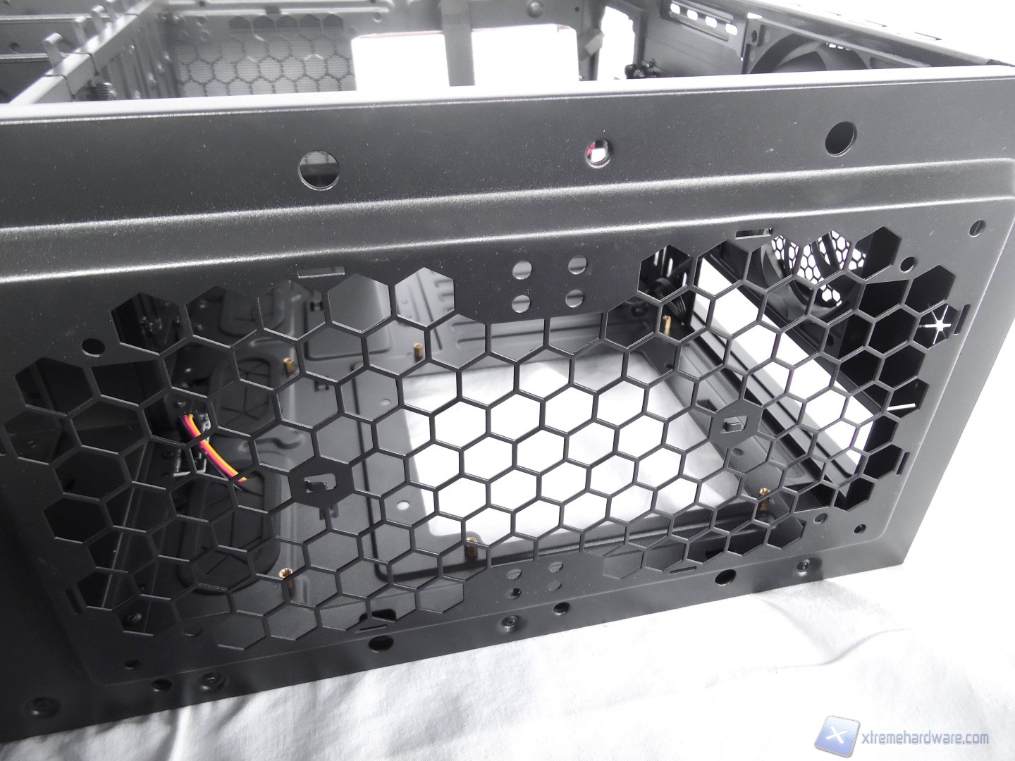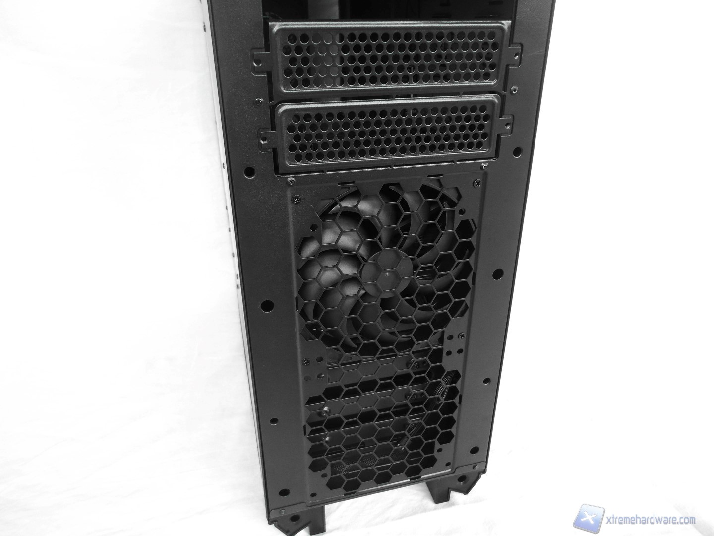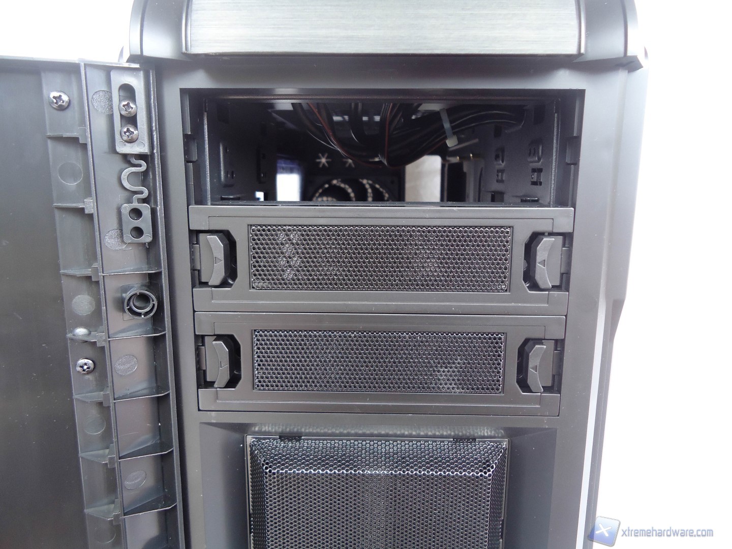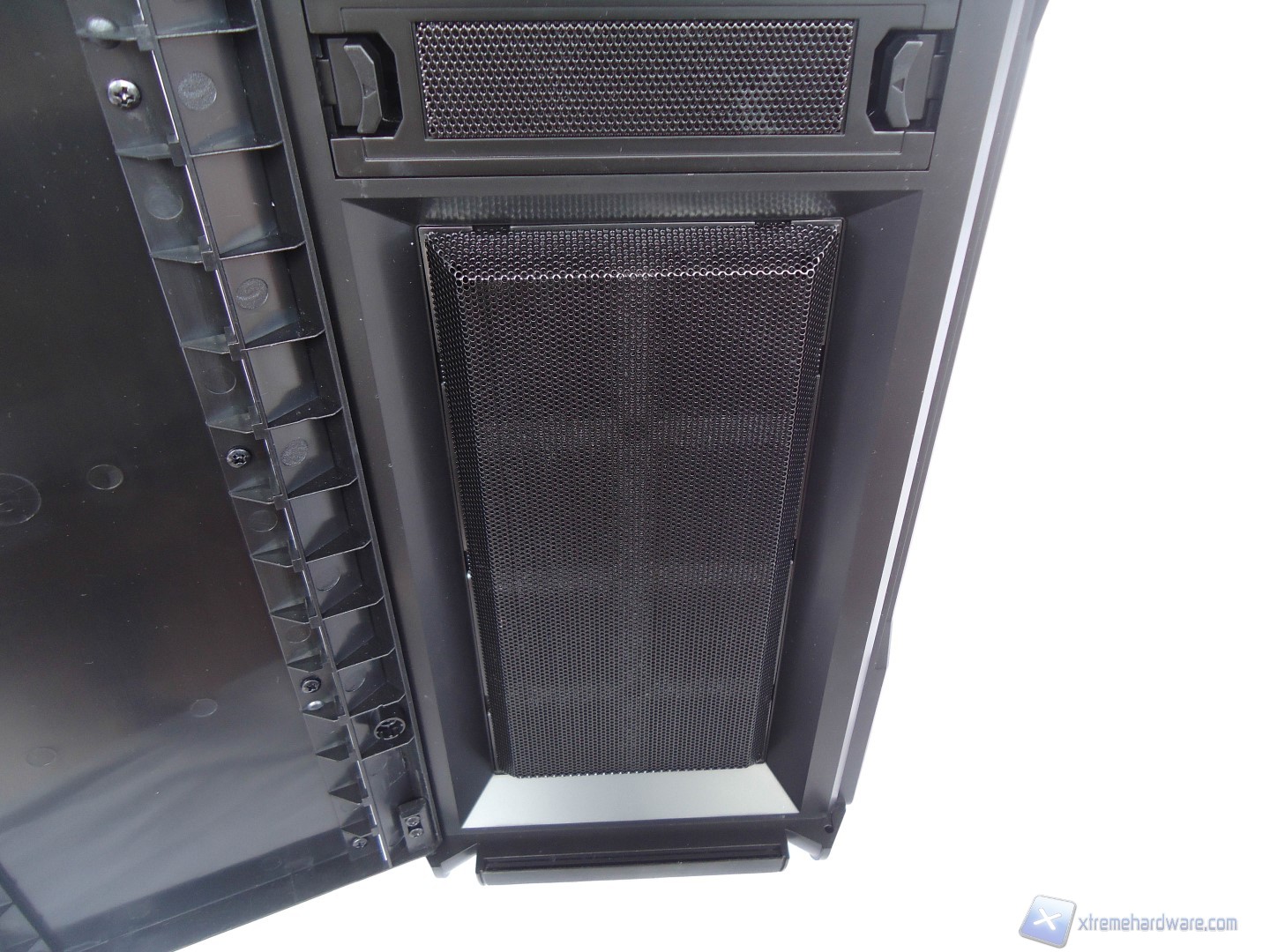 Come possiamo vedere dalle foto sottostanti il case presenta un frontale in alluminio spazzolato, che ne conferisce un aspetto molto elegante adatto anche ai salotti e uffici più ricercati. I lati del pannello frontale sono in plastica e grazie al loro design permettono di spezzare la linearità della parte frontale. Inoltre, nella parte sinistra troviamo i perni che ci permettono di aprire lo sportellino frontale che copre i bay da 5,25” e il filtro per le ventole anteriori. L’interno dello sportellino è realizzato in plastica e presenta due calamite sull’estremità destra che consentono una chiusura davvero salda. I copri bay da 5,25” sono forati e dotati di filtro antipolvere; si rimuovono facilmente premendone i lati come indicato dalle frecce. Più in basso troviamo una parte dedicata all’ingresso dell’aria per le ventole anteriori. Questa parte di acciaio forato presenta nella parte posteriore un filtro antipolvere removibile e lavabile. Per estrarre questo filtro dobbiamo per prima cosa rimuovere completamente il pannello frontale e successivamente svitare due viti presenti posteriormente al filtro. Si tratta senza dubbio di un’operazione un po’ laboriosa rispetto ad altre soluzioni della concorrenza. Togliendo la parte frontale mettiamo in mostra i fori delle ventole anteriori e la ventola da 140mm preinstallata.