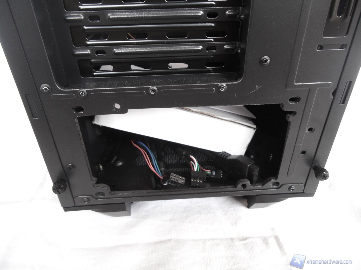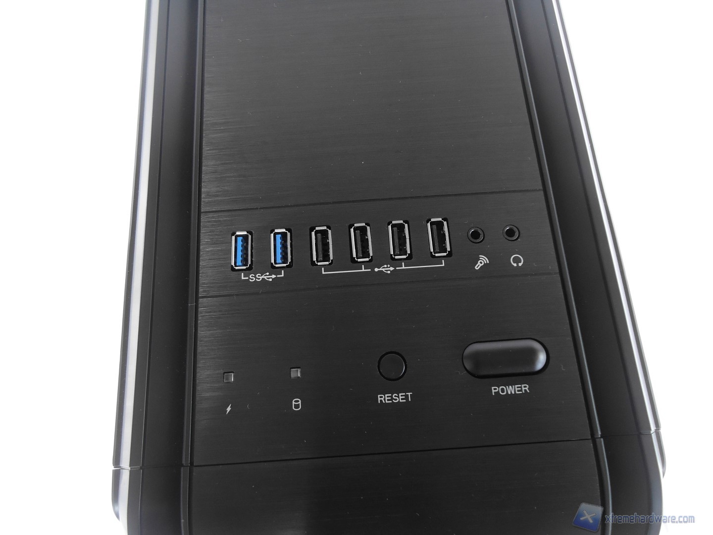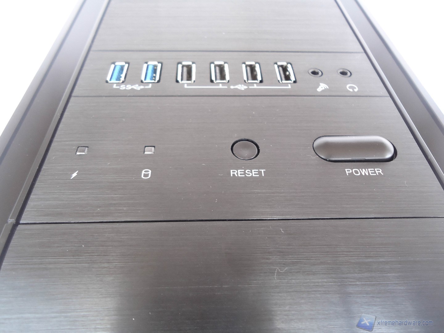 La parte superiore riprende le linee e il design della parte frontale, infatti presenta l’estensione della placca in alluminio spazzolato che abbiamo visto nel frontale. Sul top del case troviamo i vari tasti di accensione e reset oltre ai due led di stato, ma non mancano le connessioni USB che consistono in 4 USB 2.0 e 2 USB 3.0 e gli ingressi microfono e cuffie. Rimuovendo il top del case notiamo che è possibile installare superiormente due ventole da 120mm o da 140mm, anche se, contrariamente alla parte frontale, non disponiamo di un filtro antipolvere.