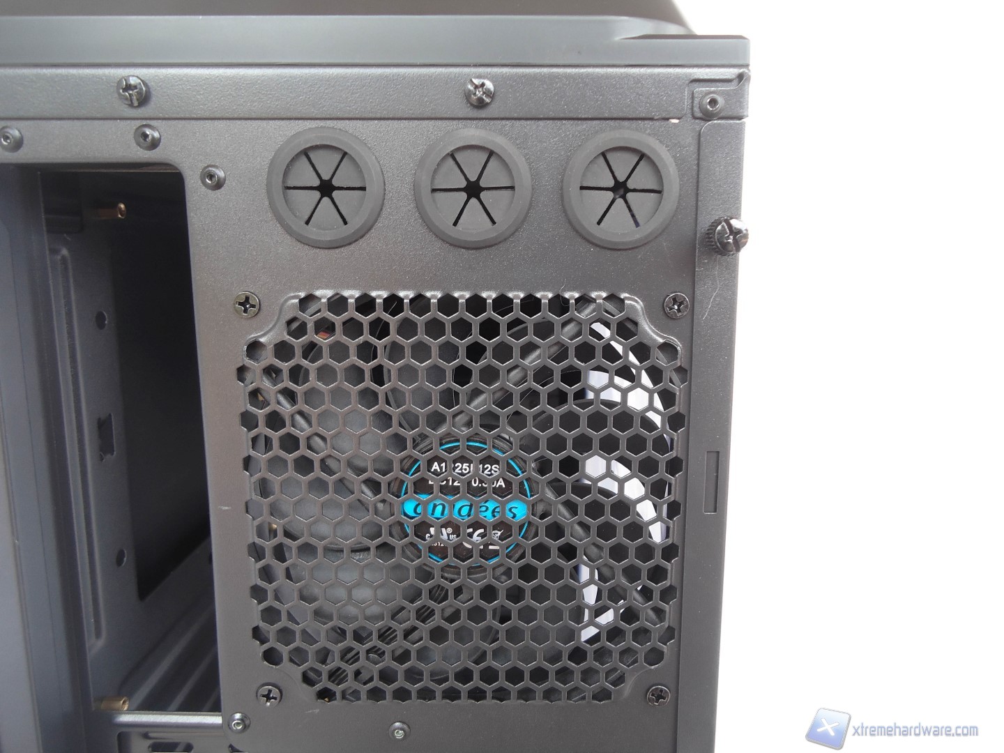 Nel retro dell’Anidees AI6 possiamo notare una classica disposizione con l’alimentatore nella parte bassa del case e la scheda madre nella parte alta. In alto a destra troviamo la presenza di tre fori con relativi gommini che permettono il passaggio dei tubi per un eventuale impianto a liquido esterno. Il montaggio esterno di un impianto a liquido è da preferire in quanto come vedremo lo spazio all’interno di questo case è risicato, anche se è comunque possibile integrare un impianto composto da un radiatore da 240mm più un radiatore da 120mm. Proseguendo l’analisi della parte posteriore notiamo che sotto i fori per il passaggio dei tubi troviamo una ventola preinstallata da 120mm, un vero peccato la mancanza di compatibilità con lo standard 140mm. A sinistra della ventola troviamo il foro per l’installazione della I/O Shield della scheda madre. In seguito notiamo la presenza dei 7+1 slot PCI perforati, quindi potrebbe essere presente il fenomeno del “negative loop” orizzontale, tale per cui le temperature della scheda grafica possono aumentare a causa del potenziale ricircolo di aria calda dall’esterno. Ciò si verifica quando c’è un fenomeno di pressione negativa, ovvero sbilanciamento tra ventole in estrazione e in immissione, in favore delle prime. L’ottavo slot posizionato verticalmente si rileva molto utile in caso di installazione di schede che non richiedono di essere installate sulla scheda madre, come ad esempio una scheda di controllo LED priva di connessione PCI o PCI-E. Per finire, troviamo il classico foro per l’implementazione di un alimentatore ATX.
