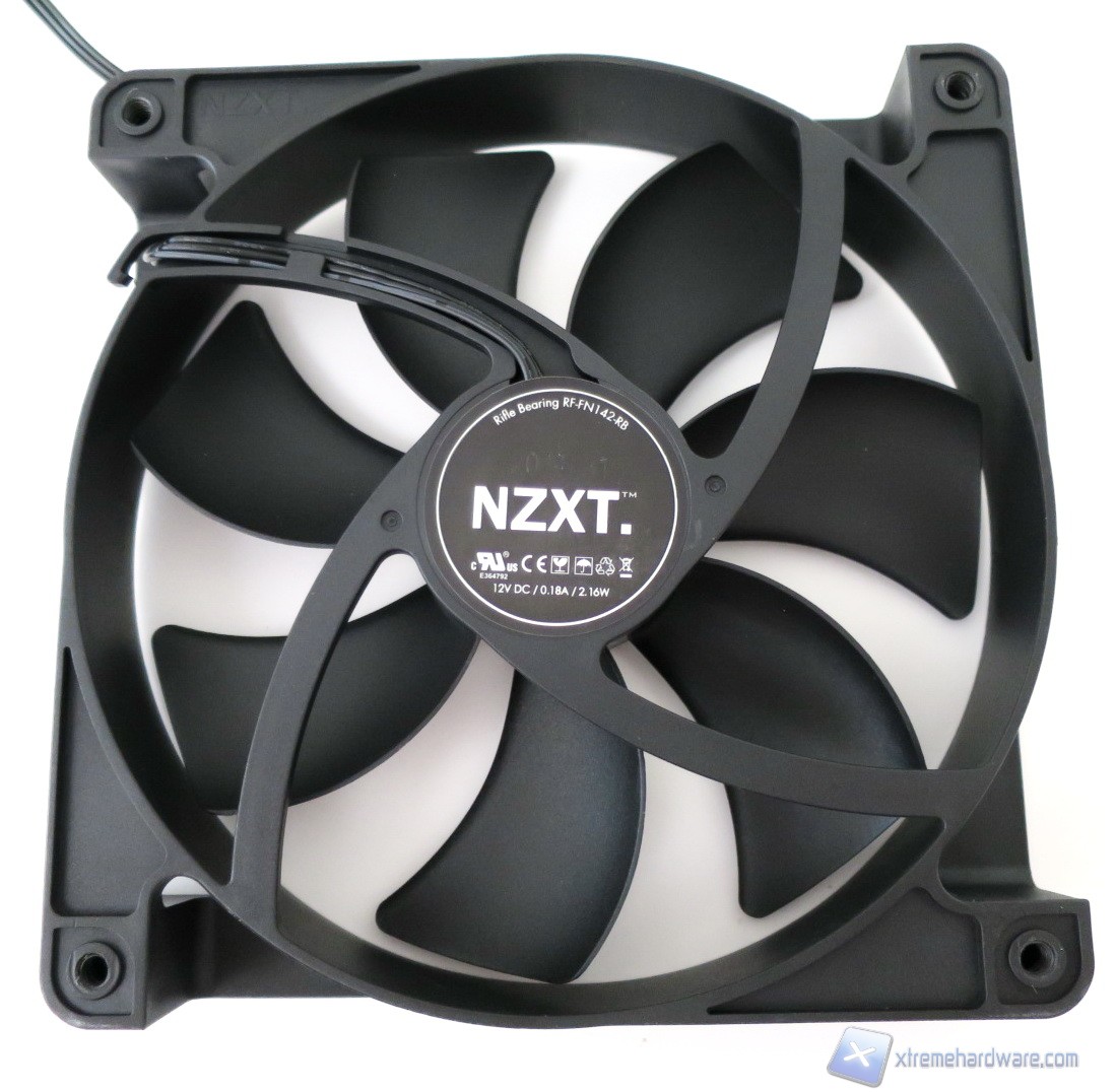 La dotazione potenziale del case è ottima considerando le tre ventole NZXT FX V2 da 120 millimetri poste nella parte frontale. Comunque sia, sono incluse tre ventole NZXT FX V2 da 120mm (stesso modello di quella che abbiamo visto nella precedente recensione dell’NZXT Kraken X31) e una da 140mm, modello RF-FN142-RB sul retro del cabinet.
