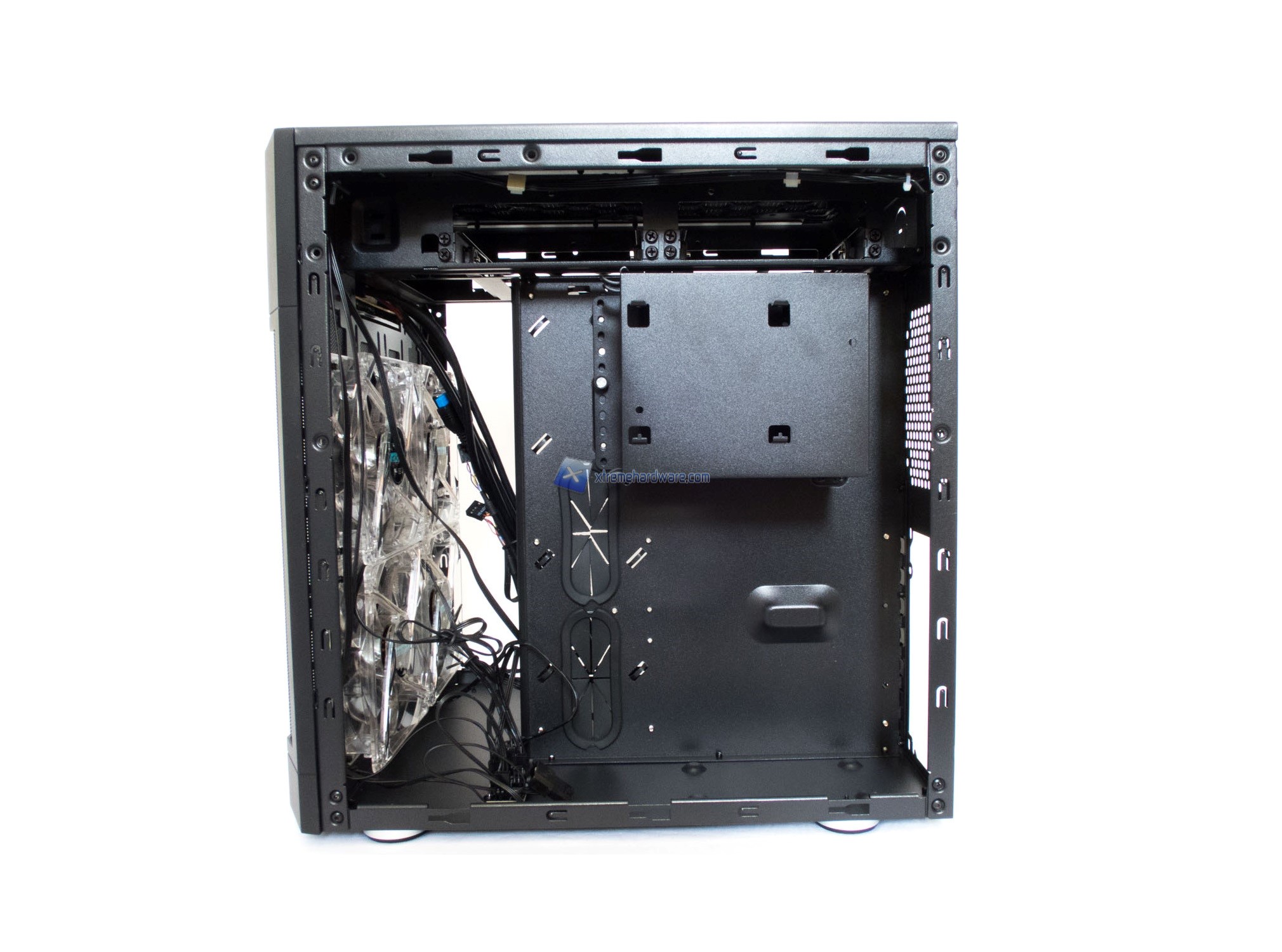 Passando al frontale nella parte interna osserviamo le ben 4 ventole da 120mm a LED Blu che forniranno un buon flusso d’aria.