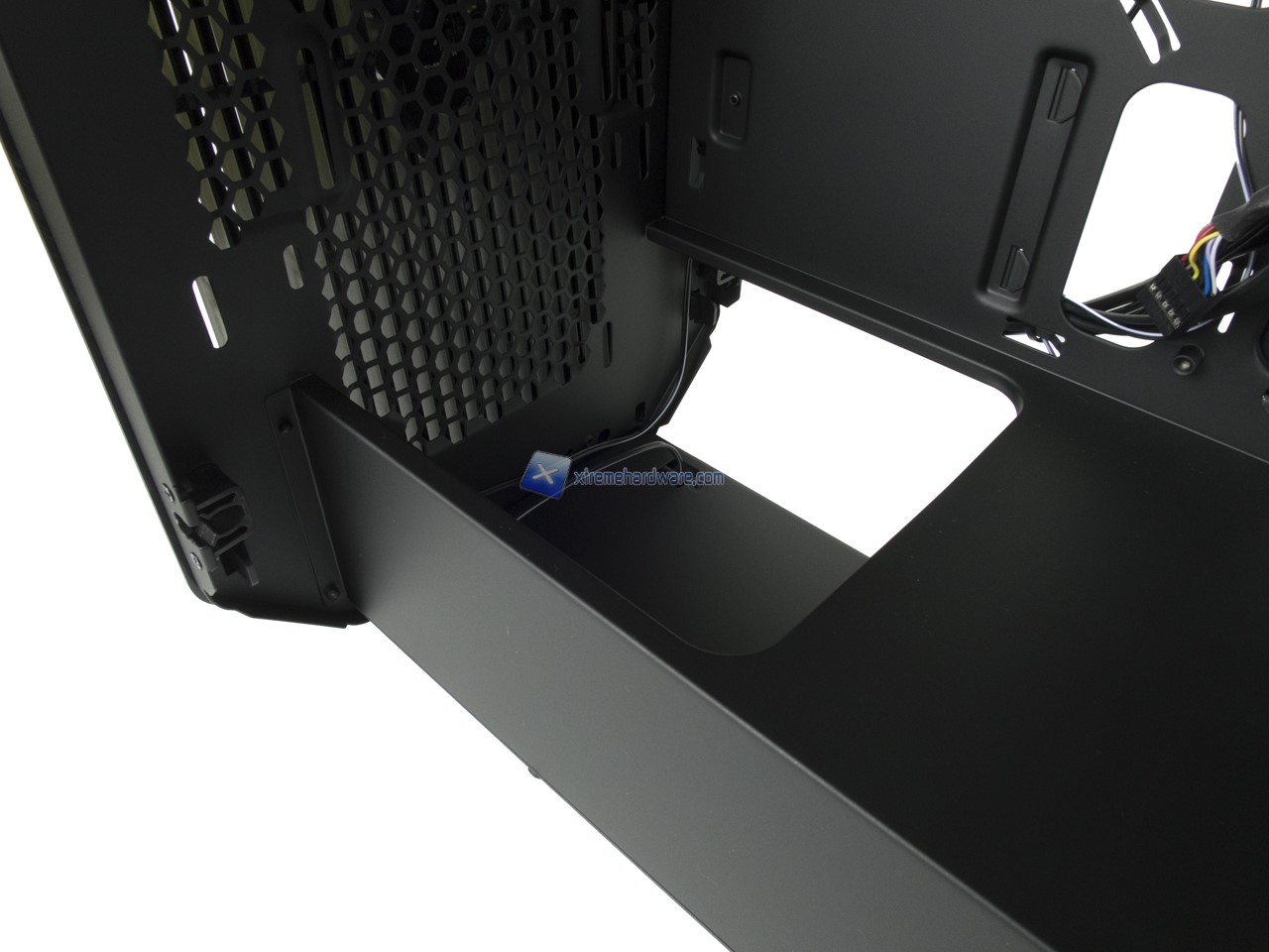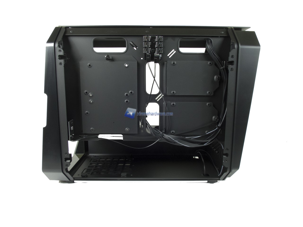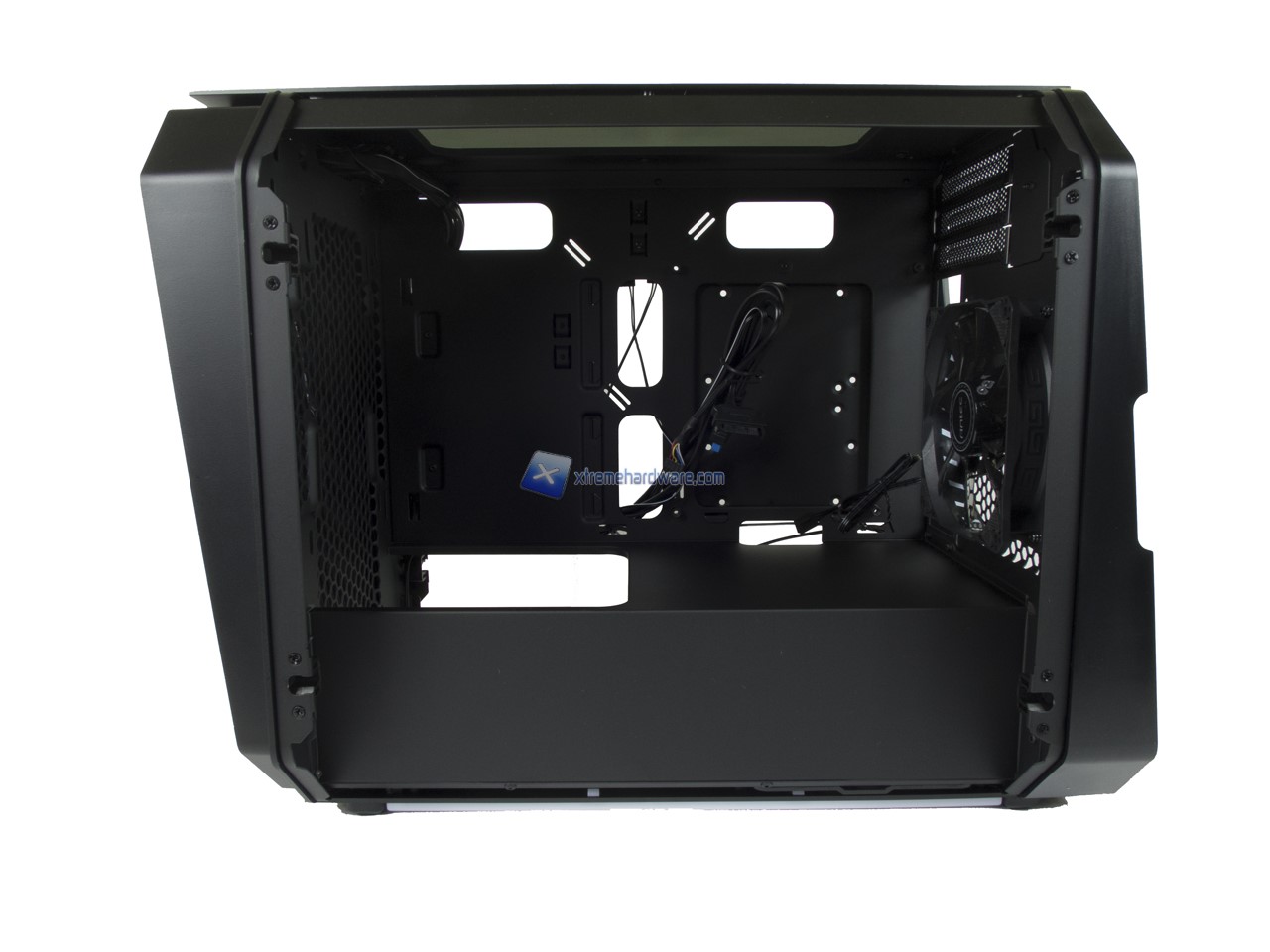 Il lato di destra invece ci mostra il Tray della scheda madre, quattro fori di valide dimensioni più uno più estremo lato sinistro da cui far passare i cavi e organizzare al meglio il cablaggio. Centralmente il Tray è presente l’immancabile foro con cui potremo installare o rimuovere a seguire il backplate del nostro dissipatore senza smontare la scheda madre o gli altri componenti. Di base osserviamo come tale foro sia ‘’coperto’’ dal Tray/supporto adibito all’installazione di un singolo Hard Disk da 3,5’’ nel lato posteriore. Da questa angolazione possiamo osservare meglio anche i tre slot PCI e la ventola da 120mm preinstallata.