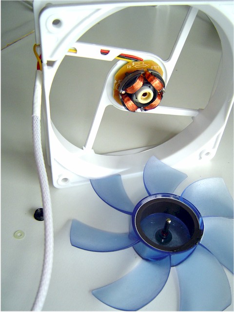 Per smontarla è necessario innanzitutto togliere l'adesivo situato dietro allo statore. Sotto di questo troviamo un ottimo gommino che evita qualsiasi fuoriuscita di olio. Un anello di plastica fissa il perno allo statore ed evita che la ventola esca dalla sua sede. Con delle pinzette si può togliere anche questo. Sotto l'anello è presente una ulteriore piccola guarnizione di gomma per mantenere una buona pressione dell'olio all'interno dello statore. Togliendo la ventola dalla propria sede si può notare come dall'altra parte non ci sia un'ottima protezione ma si affida soltanto al contatto della plastica con lo statore.