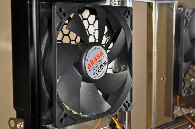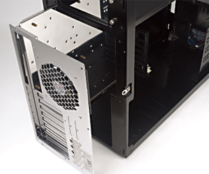 Leggermente più in basso troviamo una griglia che permette di ospitare una ventola da 120mm da 1200rpm (inclusa nel case) e in basso gli 8 slot d’espansione pci. Di solito nei case sono presenti 7 slot e questo slot addizionale ci consente di installare una periferica che non abbia bisogno di slot pci, come ad esempio porte usb, senza occupare o coprire gli slot fisici presenti nella scheda madre. Purtroppo mancano i fori per far passare i tubi dell’impianto a liquido per l’installazione esterna di un radiatore, anche se all’interno c’è spazio a sufficienza per posizionarlo.