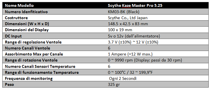 Le caratteristiche tecniche del prodotto Scythe sono davvero interessanti, partiamo da una dimensione ( W x H x D) dello chassis di 148.5 x 42.5 x 83 mm per un peso di 325gr, ed un display di ben 100 x 19 mm. Al controller posson esser collegate ben 6 ventole ed ha un range di erogazione di 3.7 V (±10%) ~ 12 V (±10%). Ogni canale può erogare fino ad 1 Ampere (=12 W max.), inoltre possiamo collegare altrettanti sensori termici per la rilevazione della temperatura. Le caratteristiche tecniche possono essere riassunte dallo schema seguente: