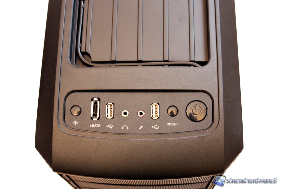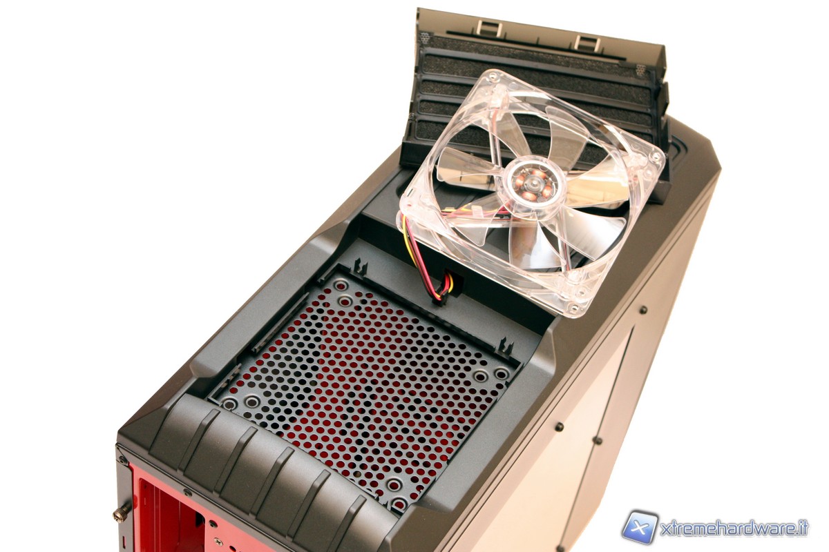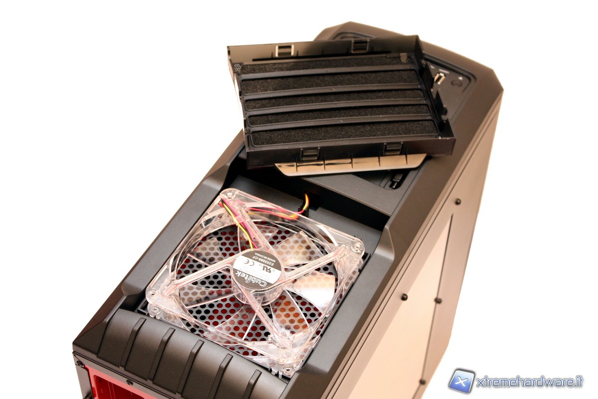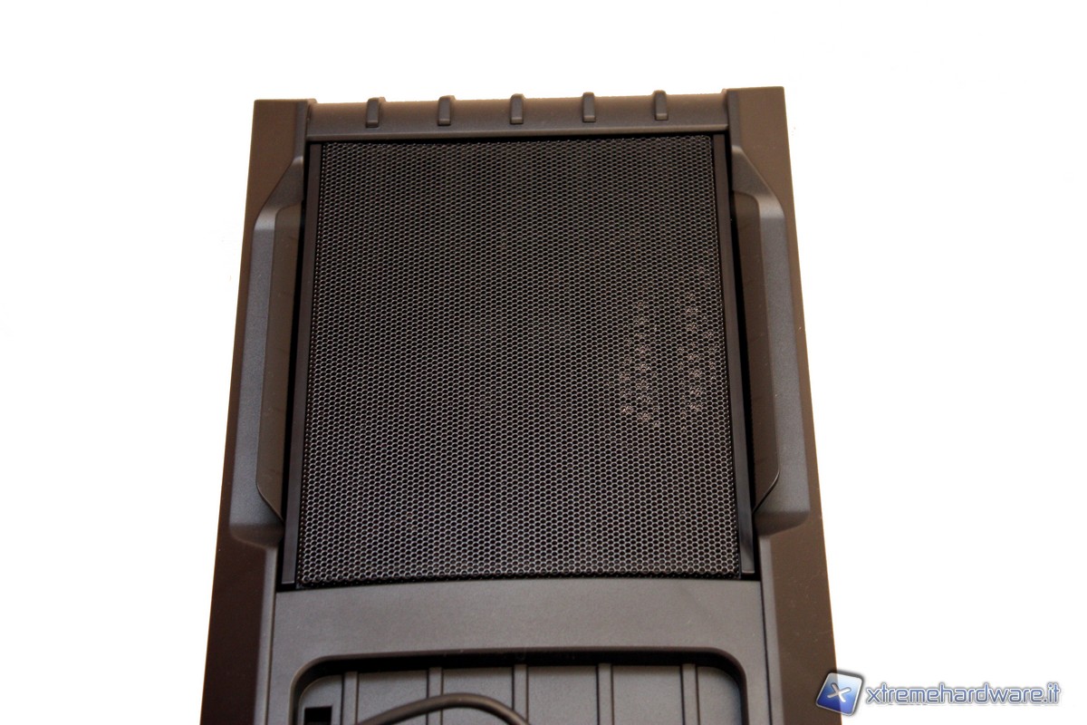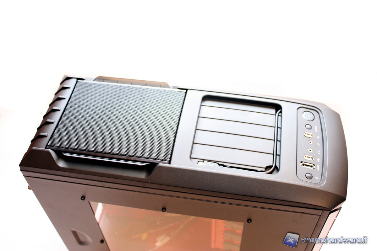 La parte superiore è forse quella più interessante, infatti troviamo un alloggio per periferiche mini usb (davvero utile per i cellulari predisposti con questa connessione), i pulsanti di accensione e reset, e il controllo led delle ventole, che quindi possono esser accesi o spenti a piacimento. Sono presenti inoltre i jack per il microfono e le cuffie, 2 porte USB 2.0 e una eSata. E' inoltre inserita una ventola in estrazione da 140mm dotata anch’essa di led rossi e filtro antipolvere, anche in questo caso rimovibile a piacimento smontando il pannello superiore con una semplice pressione.